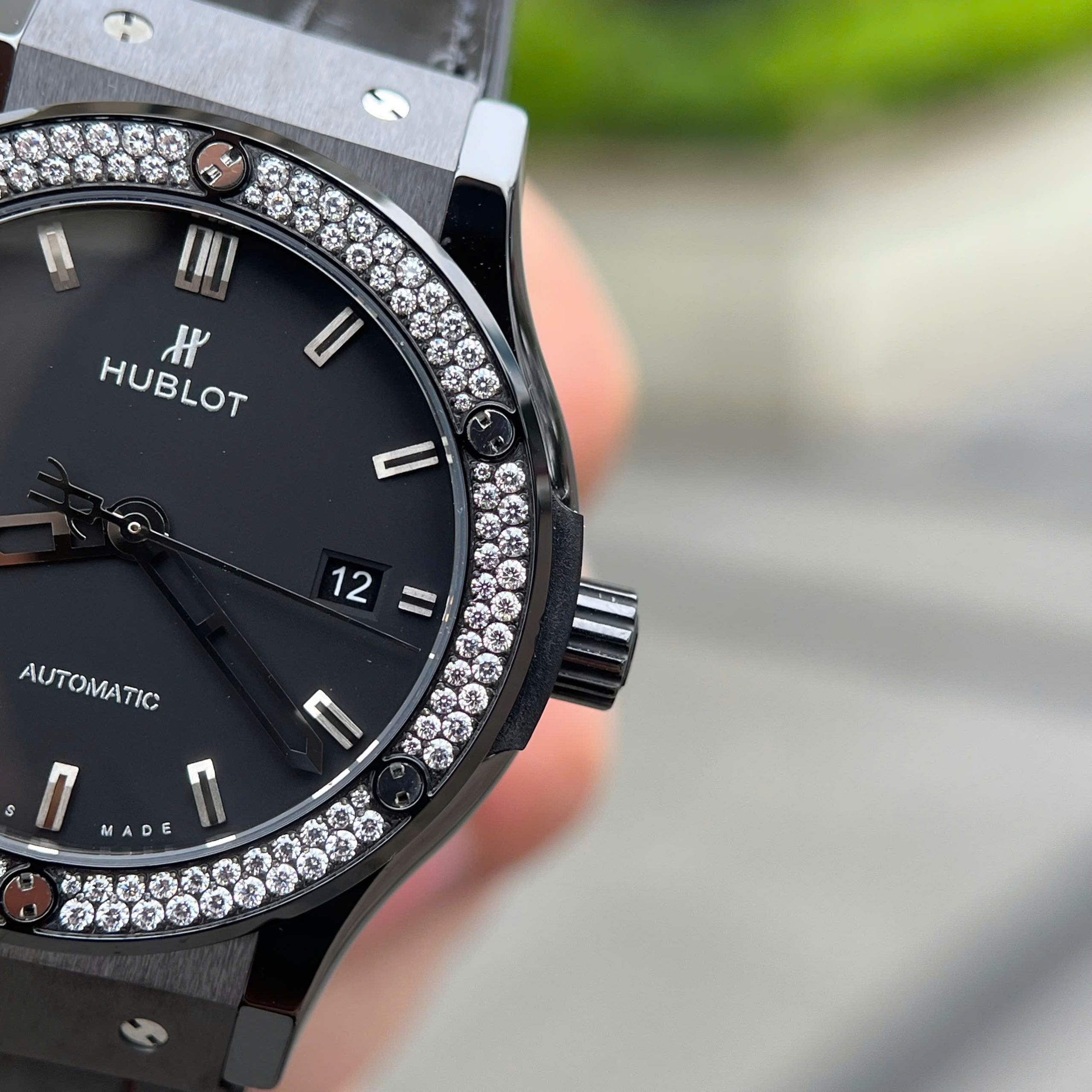 Đồng Hồ Hublot Chế Tác Vỏ Gốm Đen Ceramic Viền Đính Đá Xưởng JJZ là một kiệt tác đến từ thương hiệu Hublot, mang đến sự hòa quyện hoàn hảo giữa nét lịch lãm và phong cách thể thao mạnh mẽ. Với kích thước mặt số 42mm, mẫu đồng hồ này được thiết kế dành riêng cho những quý ông yêu thích sự sang trọng và cá tính nổi bật.