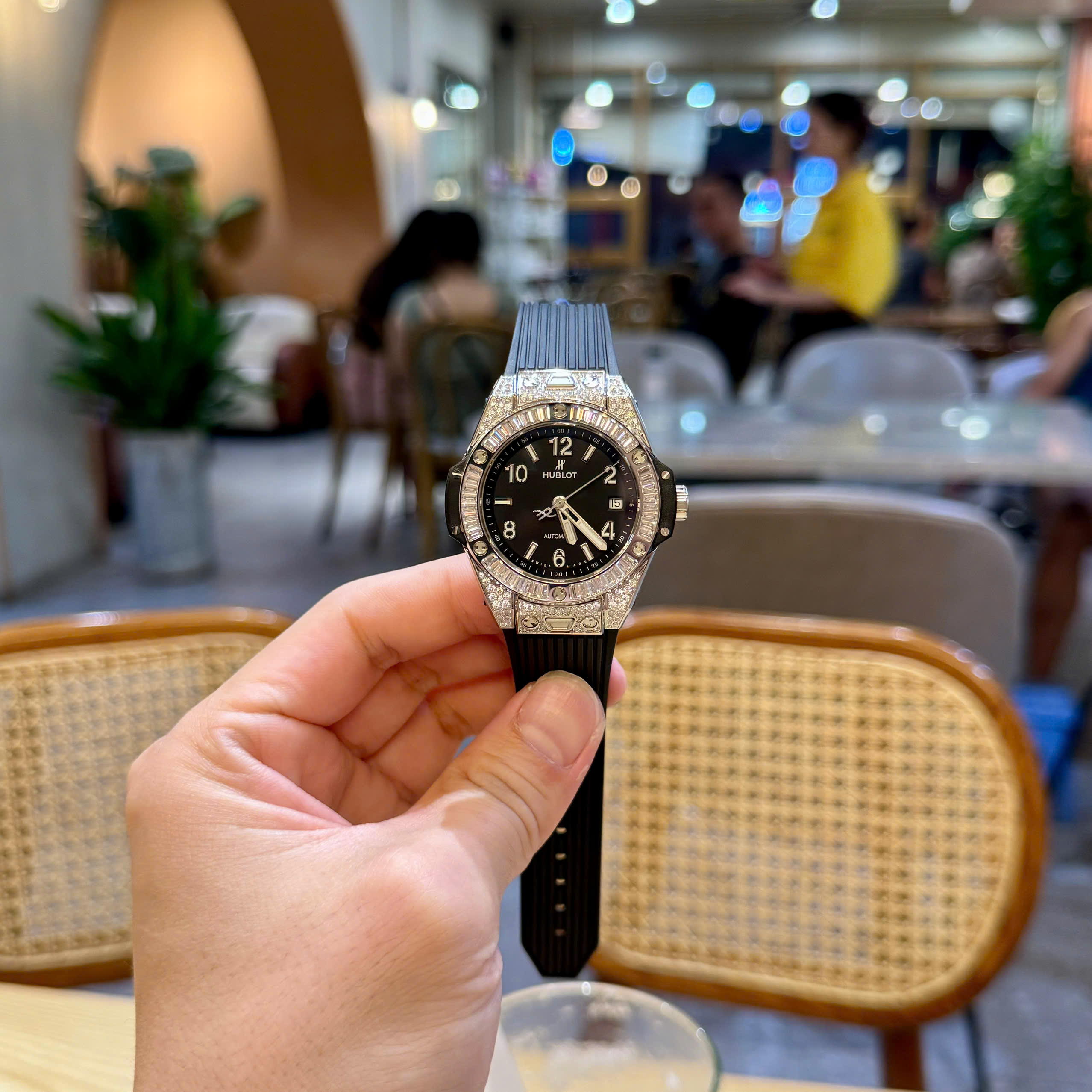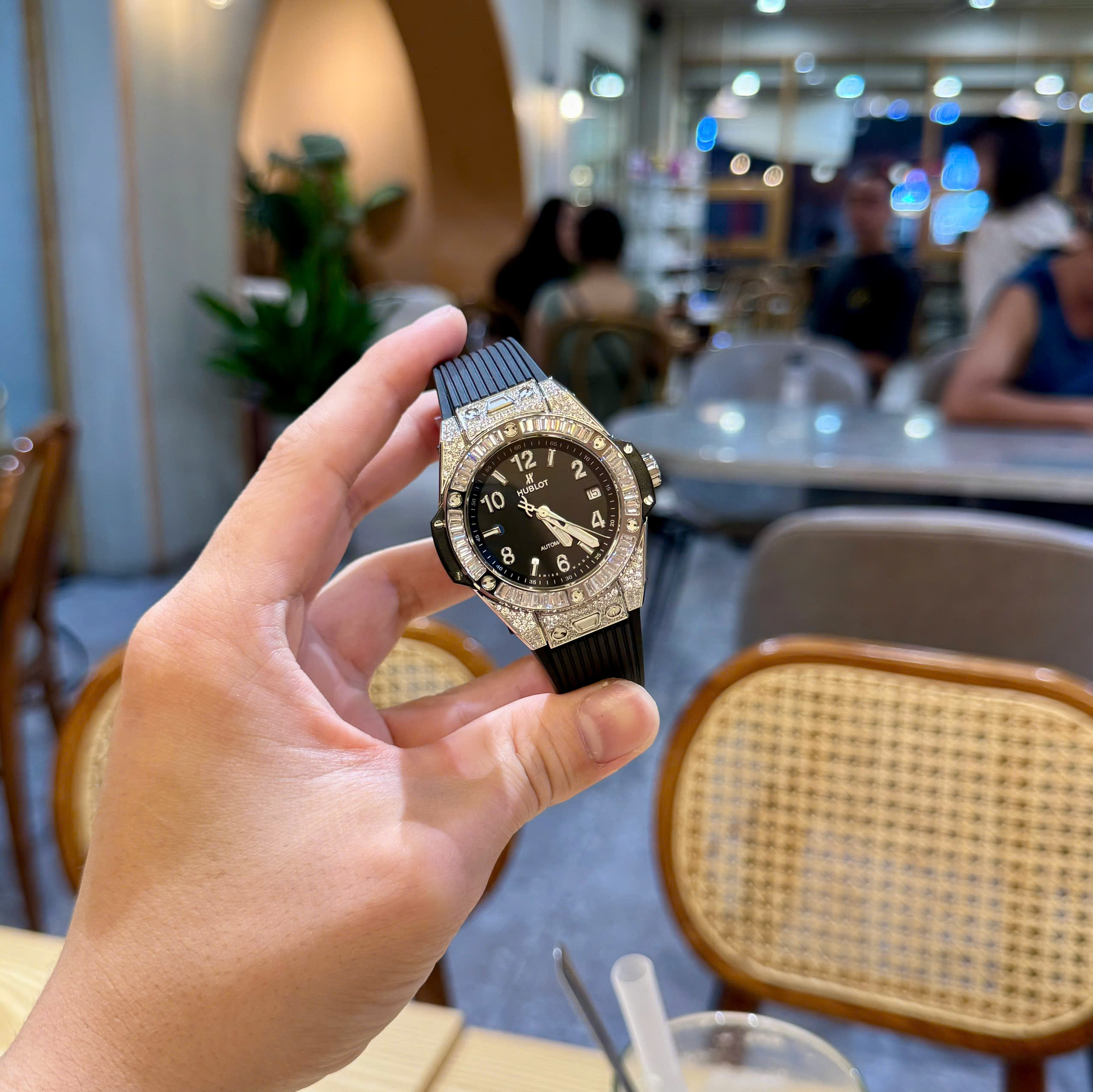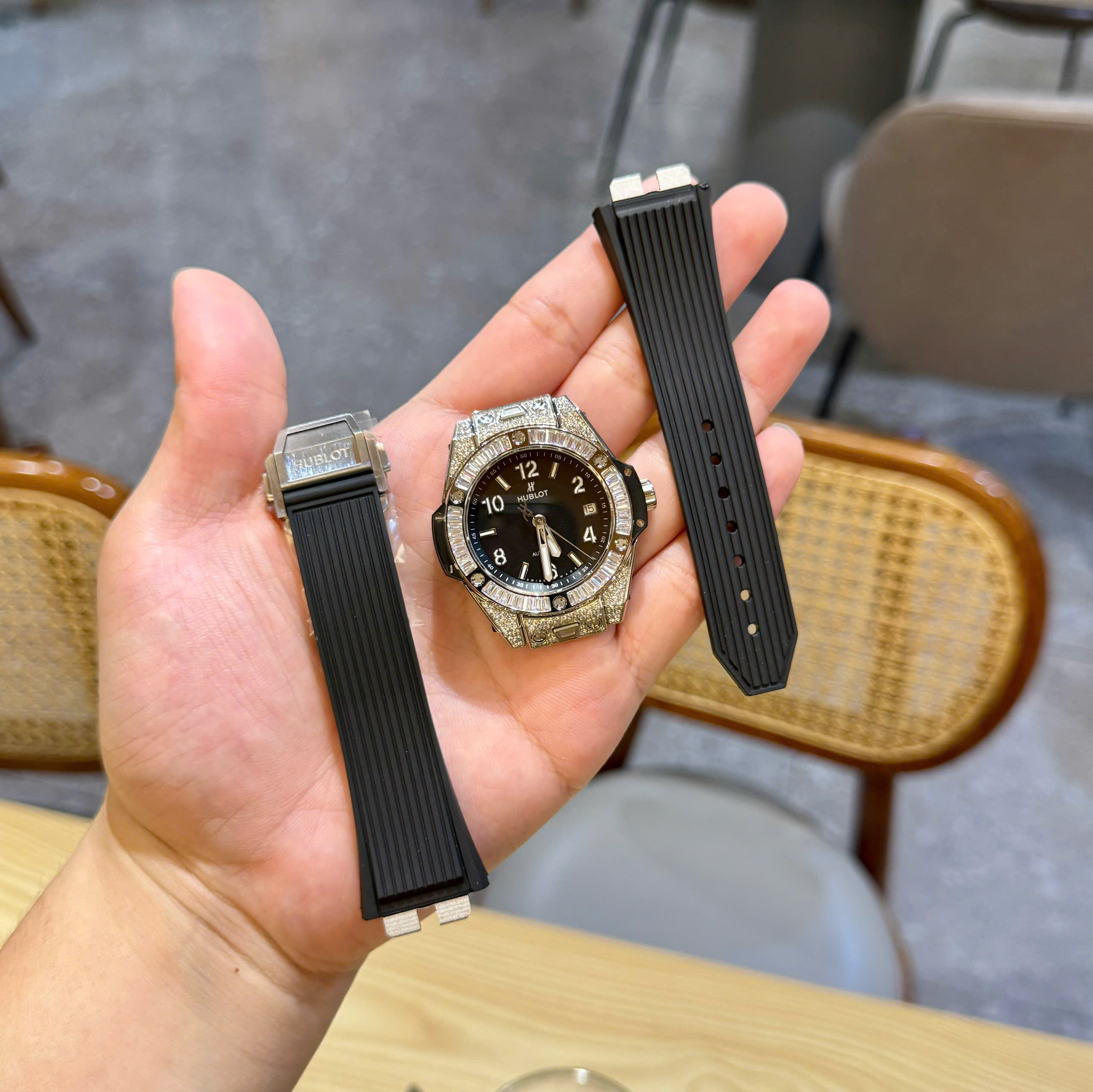 Đồng Hồ Hublot Dây Cao Su Màu Đen Đính Full Đá Big Bang One Click 39mm