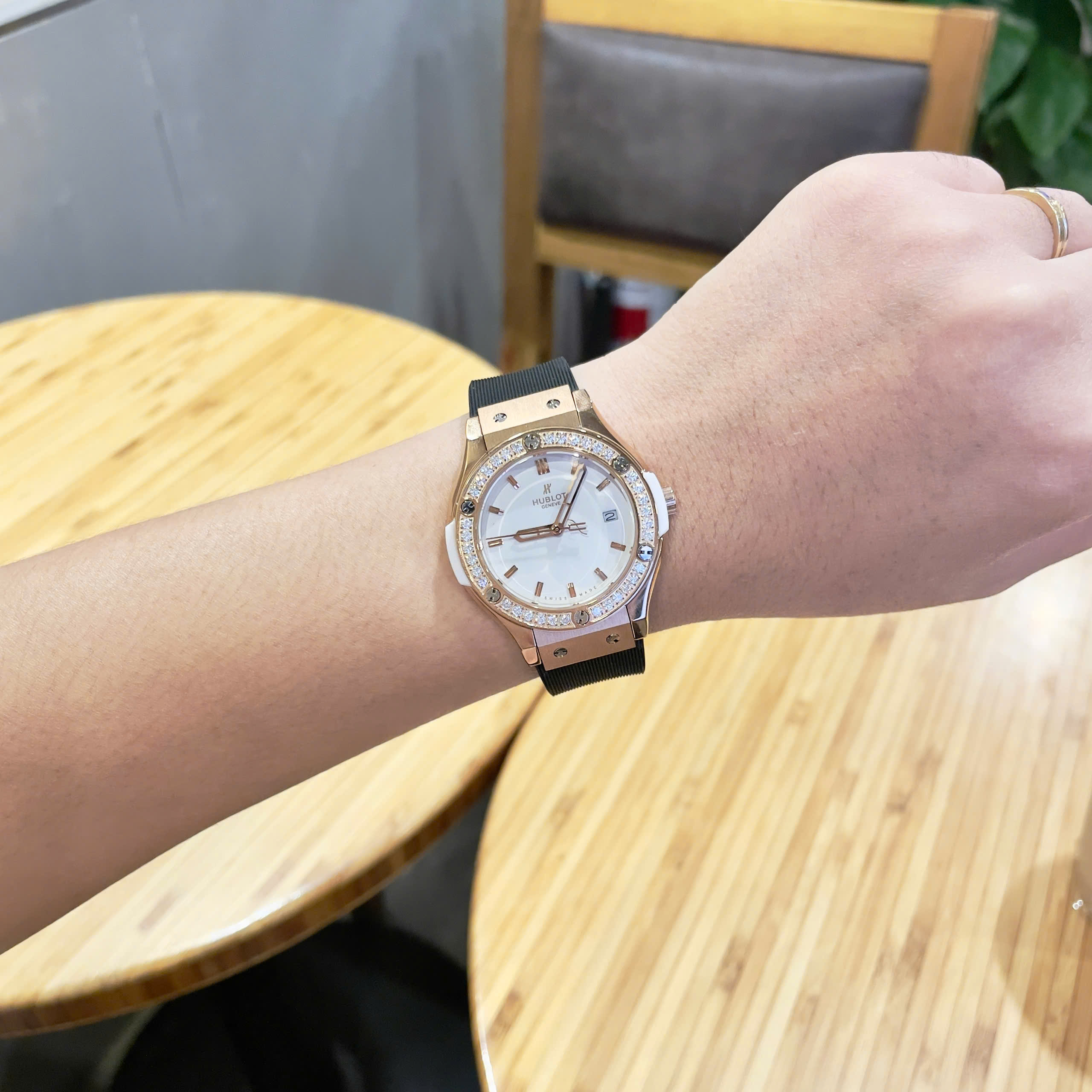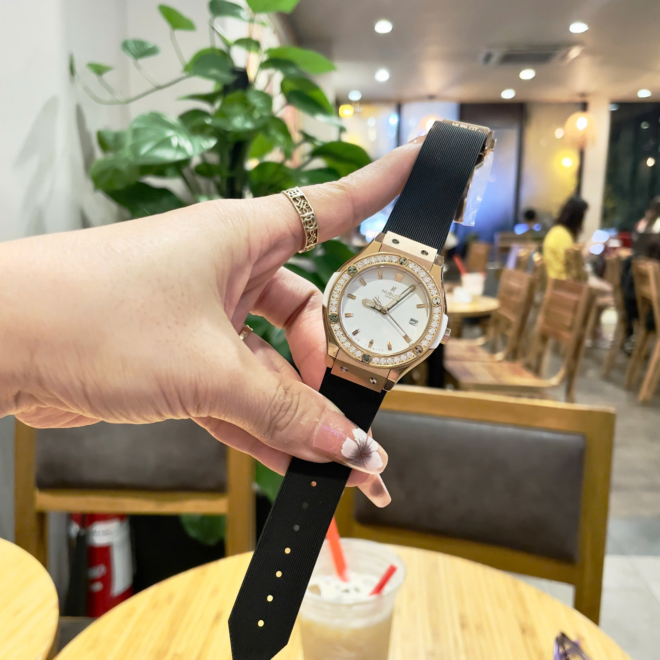 Đồng Hồ Hublot Nữ Dây Cao Su Màu Đen Đính Đá Máy Pin Nhật 34mm