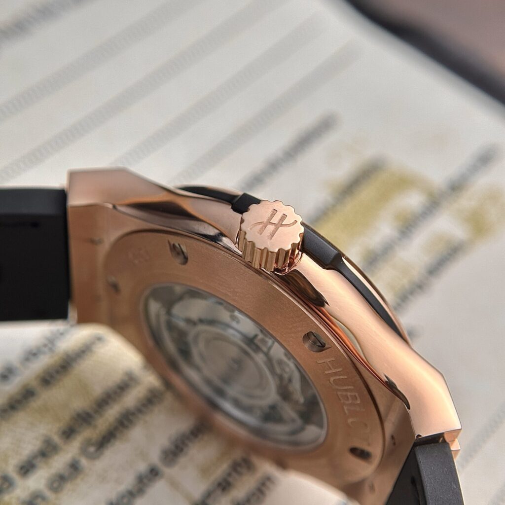 Thiết kế mặt số đơn giản nhưng tinh tế, với các kim và cọc số được làm tỉ mỉ, cùng ô cửa sổ báo ngày tiện lợi tại vị trí 3 giờ. Bộ chuyển động tự động bên trong là một trong những điểm nhấn của sản phẩm, đảm bảo sự chính xác và độ bền bỉ. Mặt kính sapphire chống xước giúp bảo vệ đồng hồ Hublot Replica khỏi những tác động bên ngoài, trong khi dây da cá sấu cao cấp mang lại cảm giác thoải mái khi đeo.