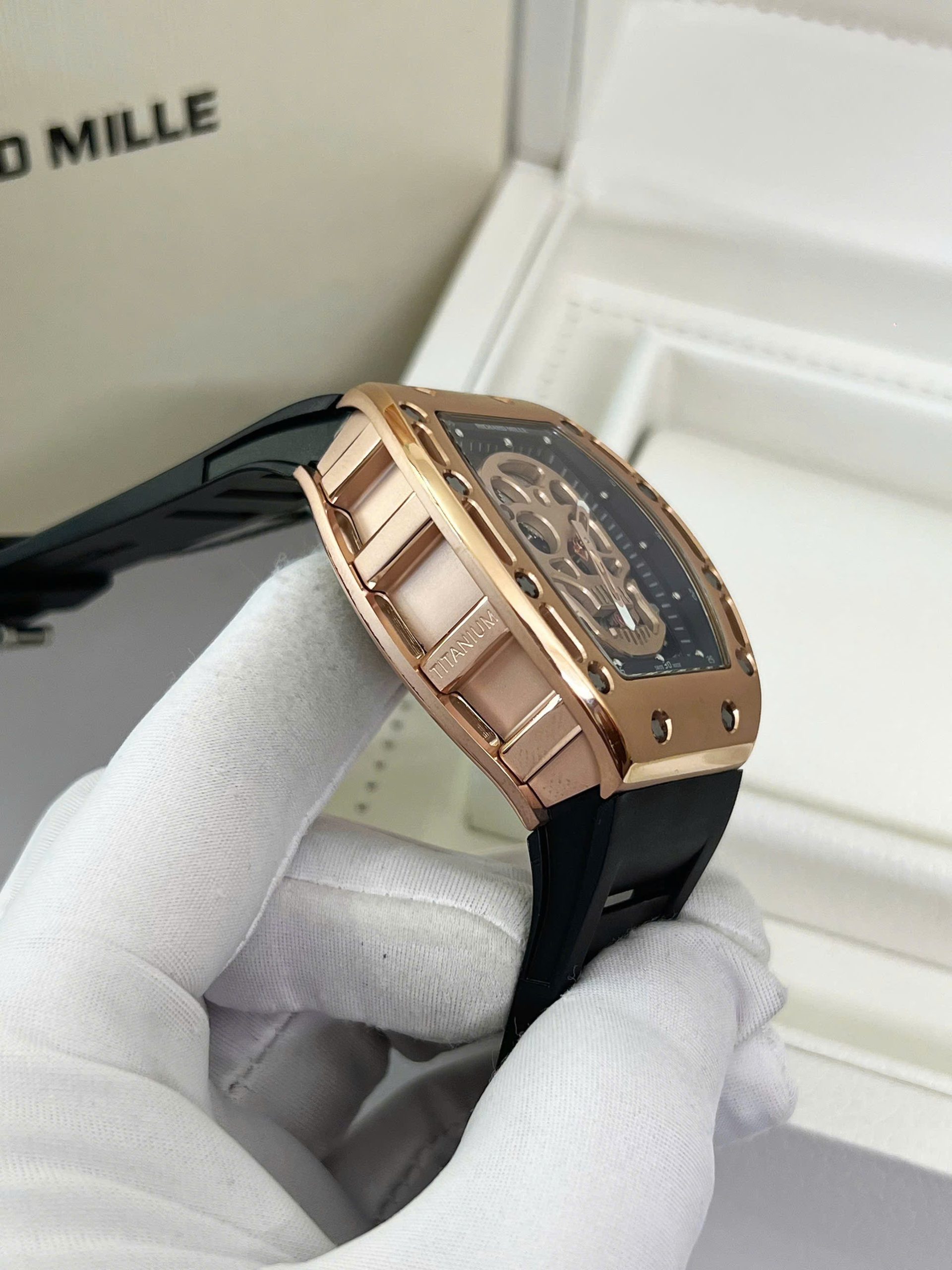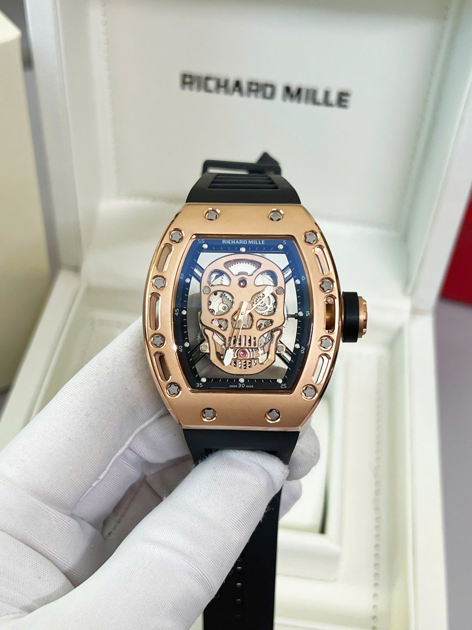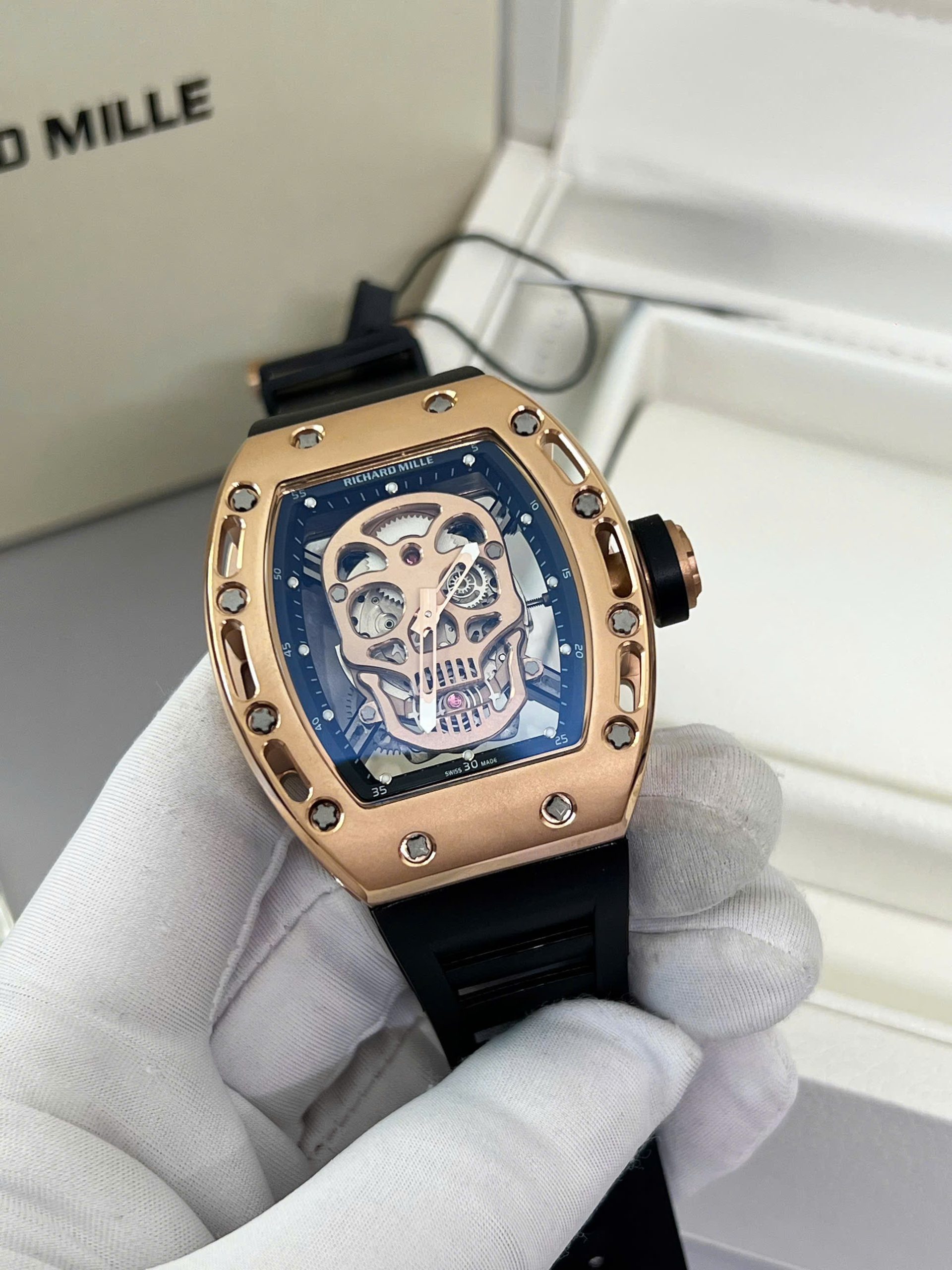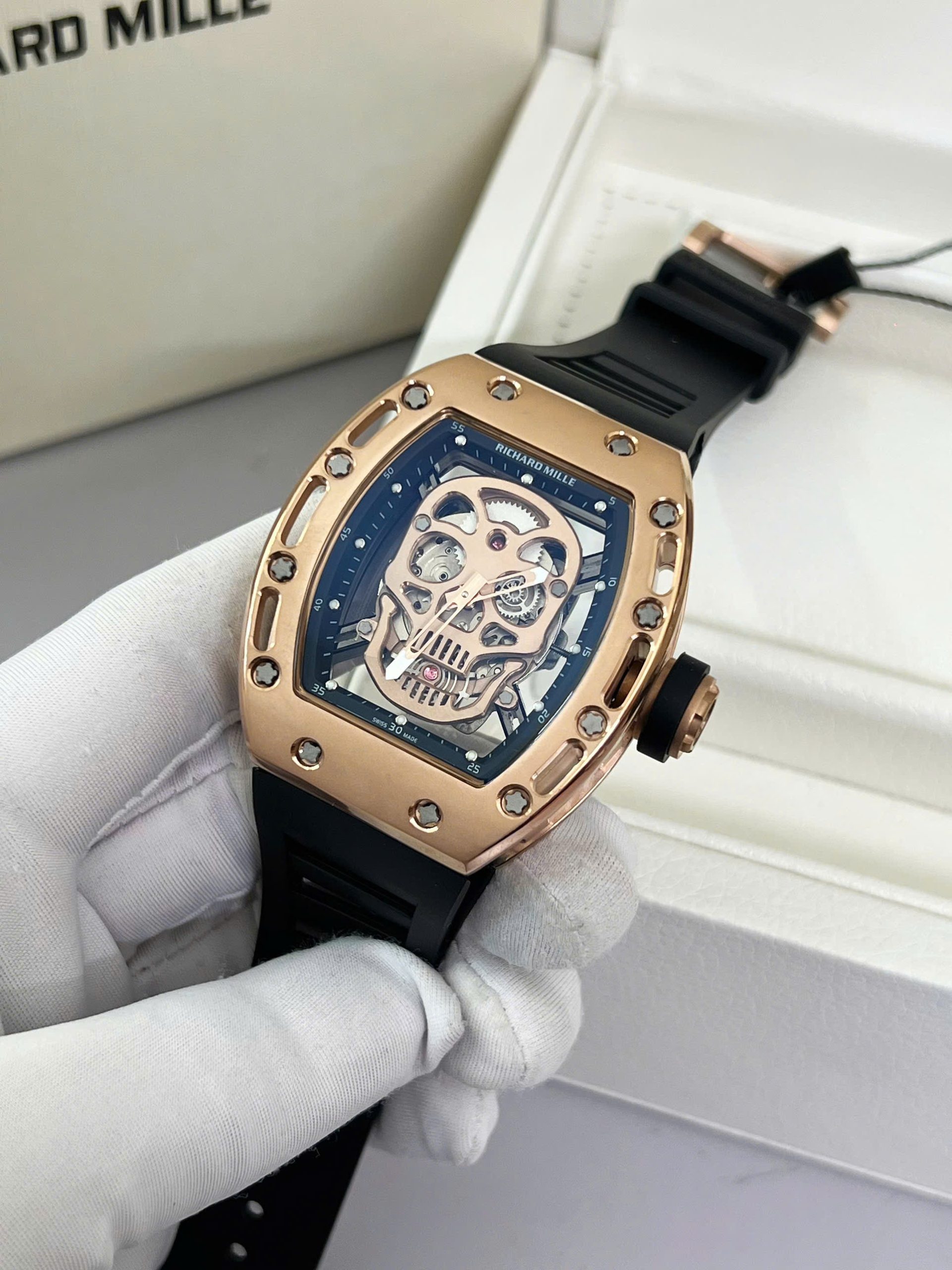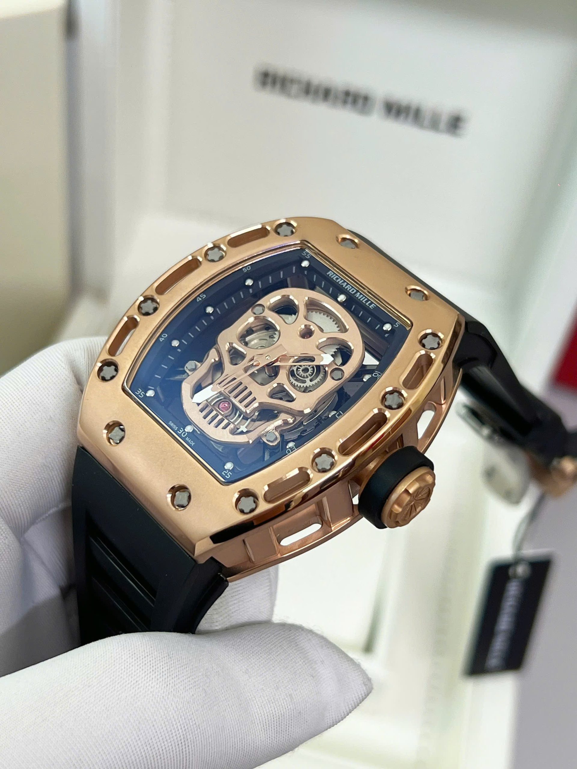 Đồng Hồ Nam Richard Mille RM052 Vàng Hồng Super Fake Họa Tiết Đầu Lâu 42mm