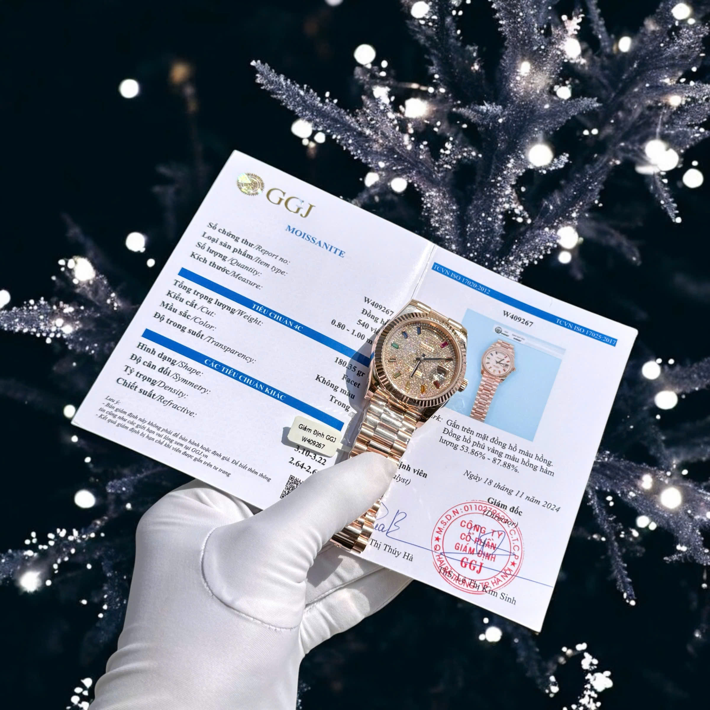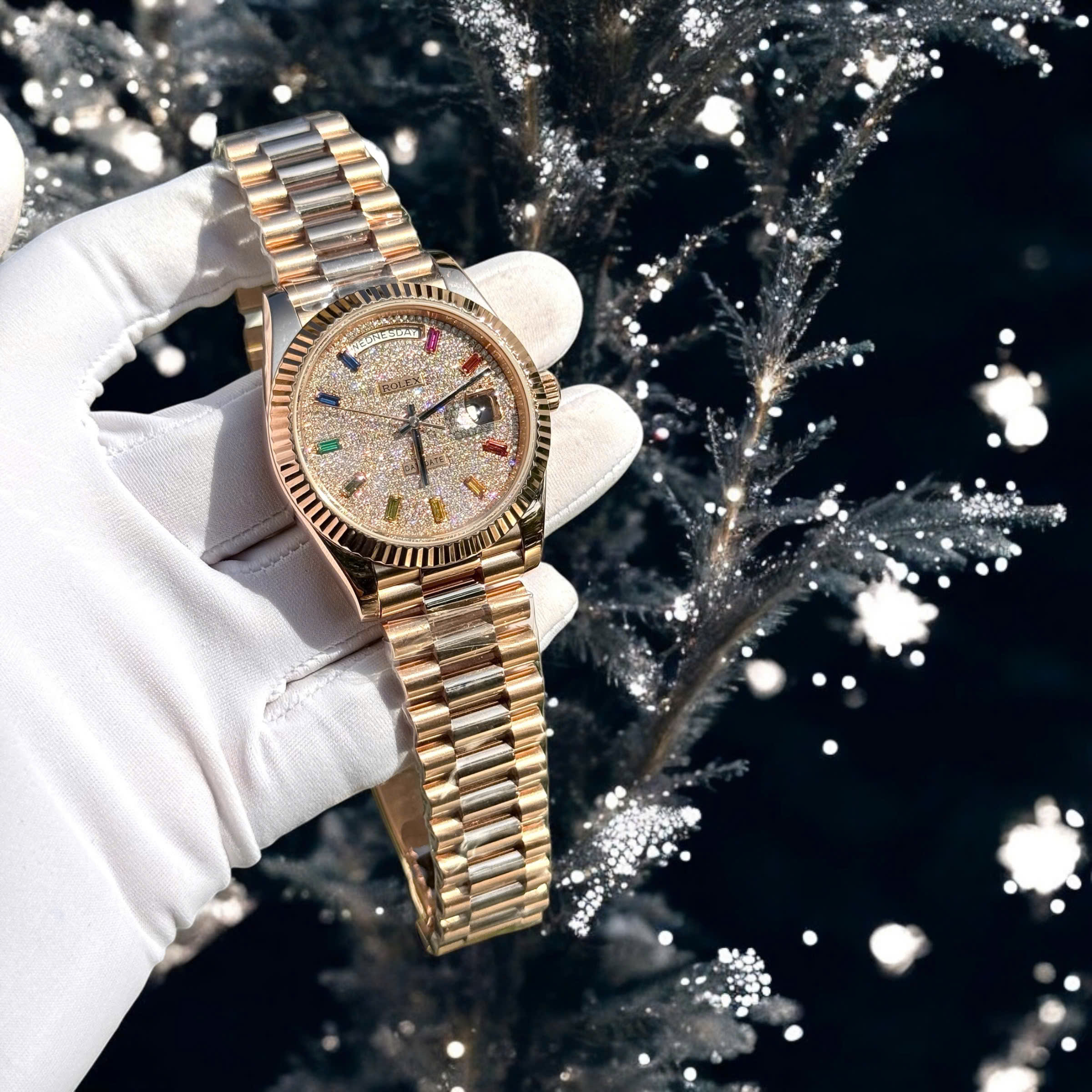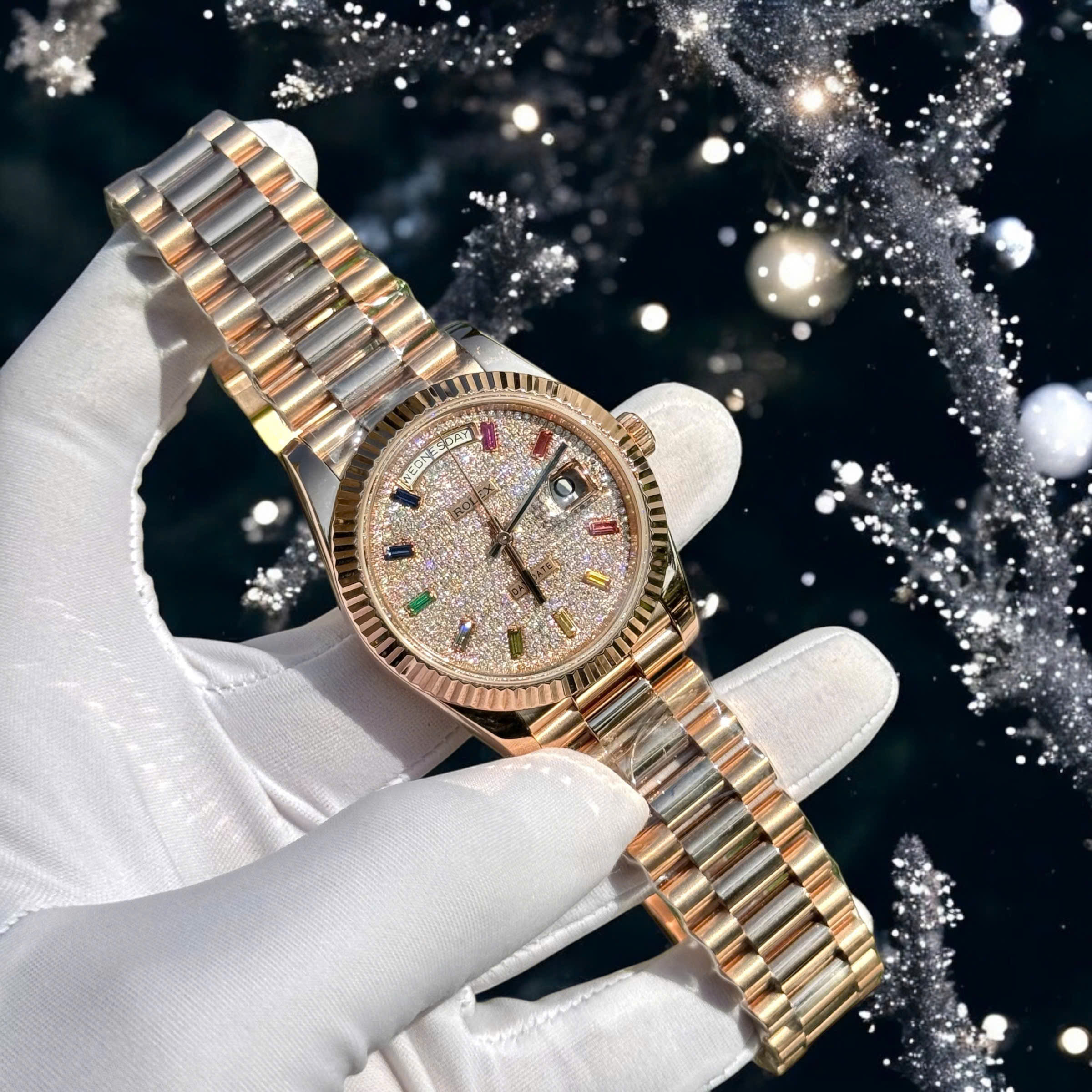 Đồng Hồ Rolex Chế Tác Phủ Vàng Hồng 18K Mặt Số Đính Đá Moissanite Hong Kong Day-Date 40mm