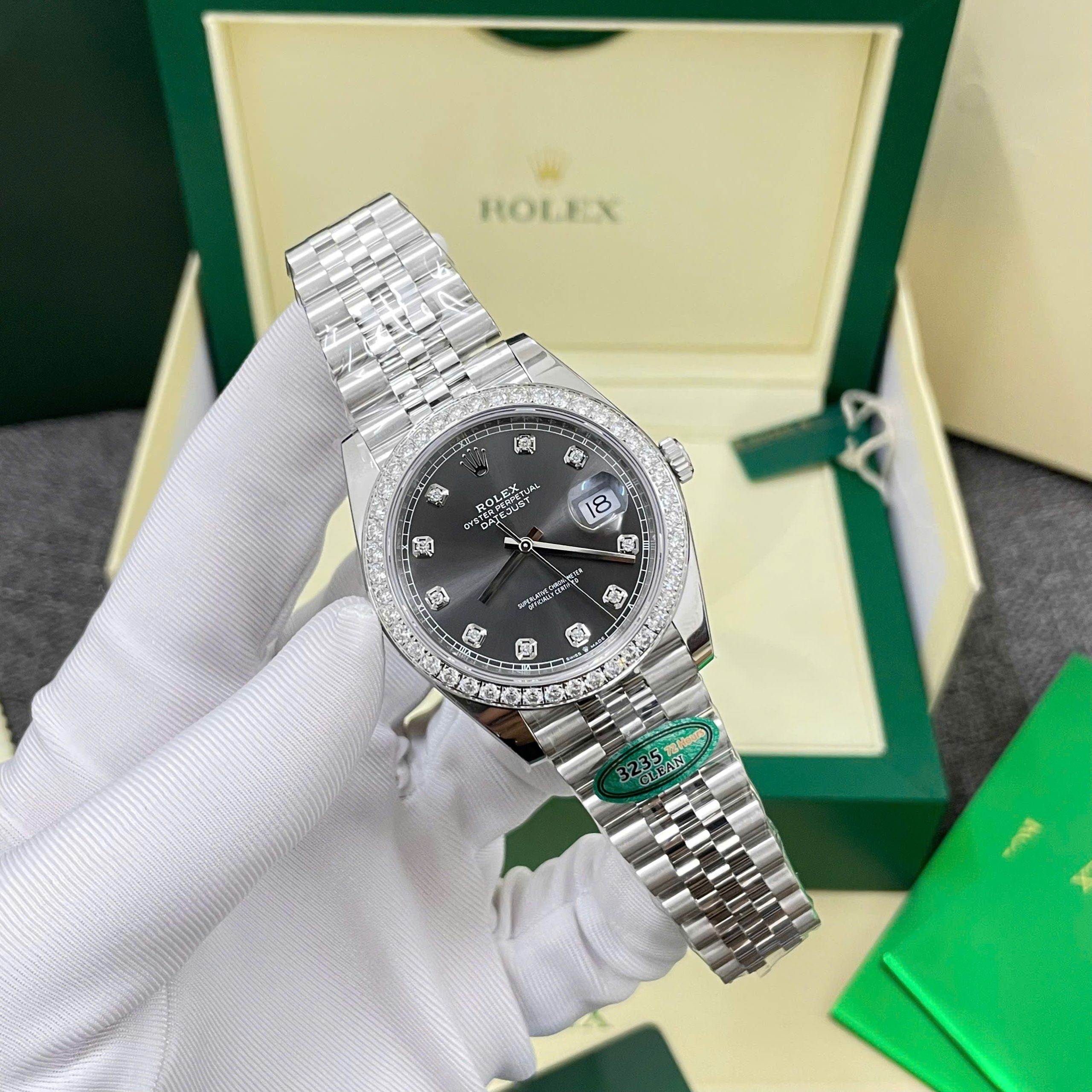 Đồng Hồ Rolex DateJust Chế Tác Mặt Xám Viền Đính Đá Moissnaite Xưởng Clean 41mm