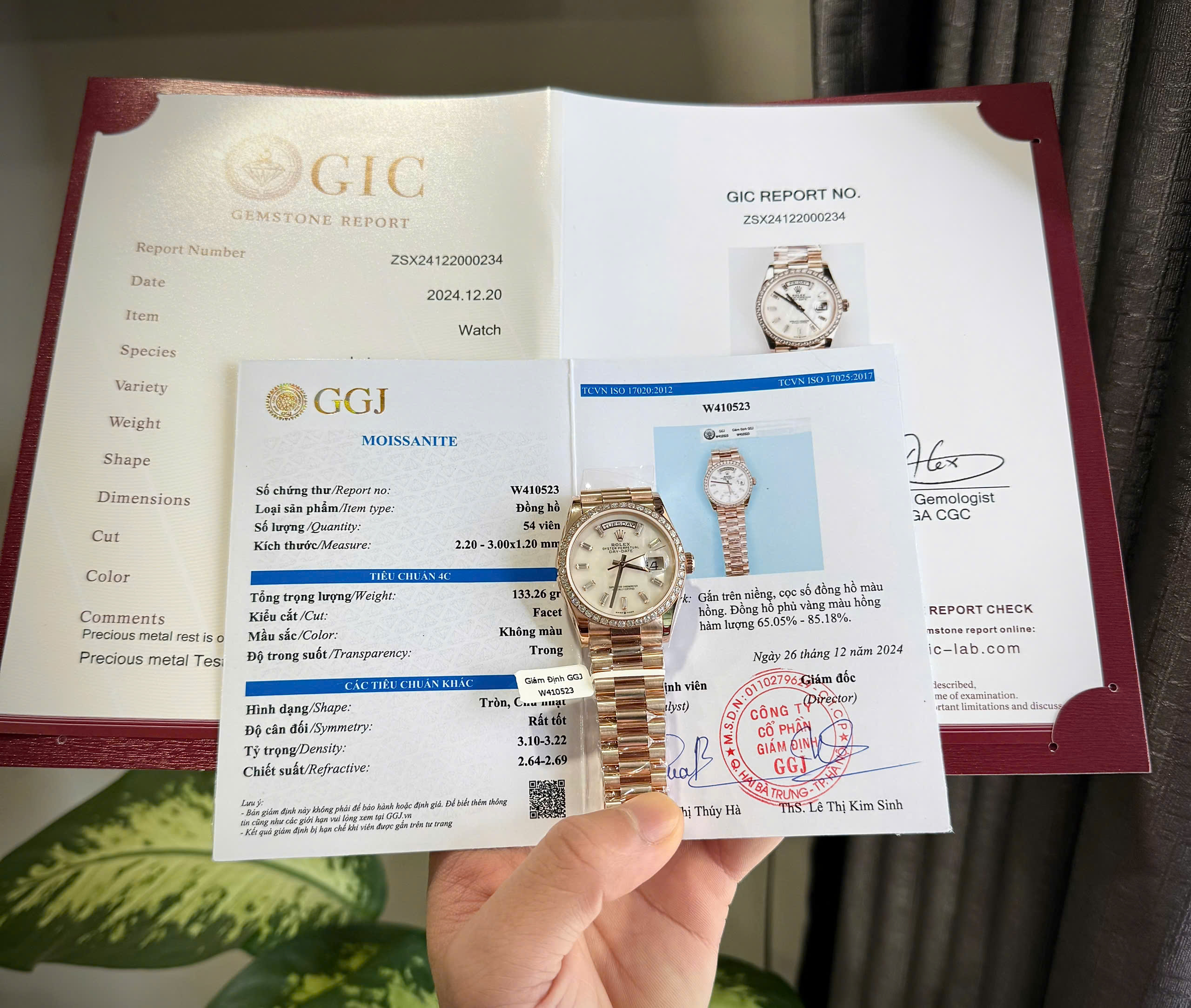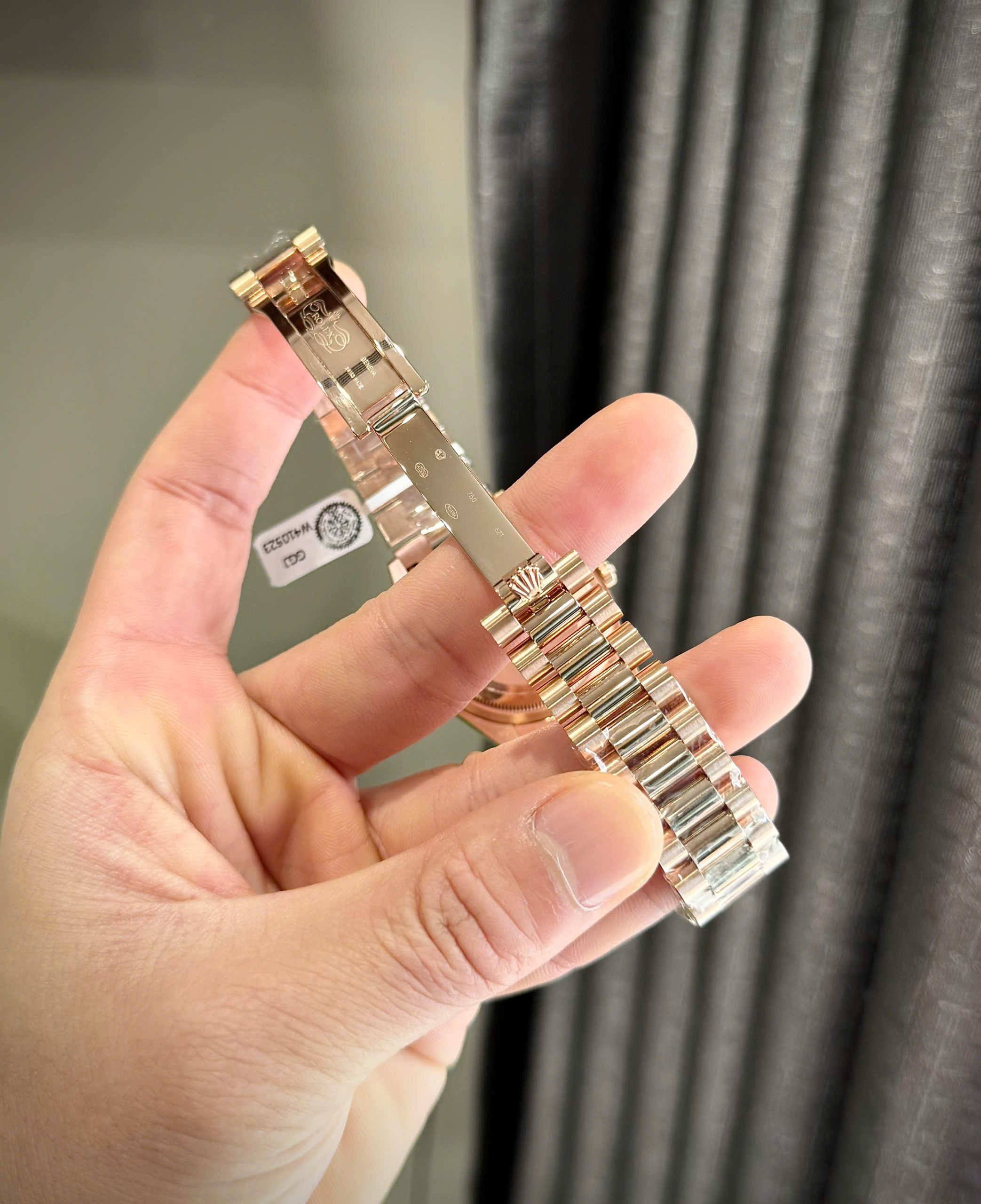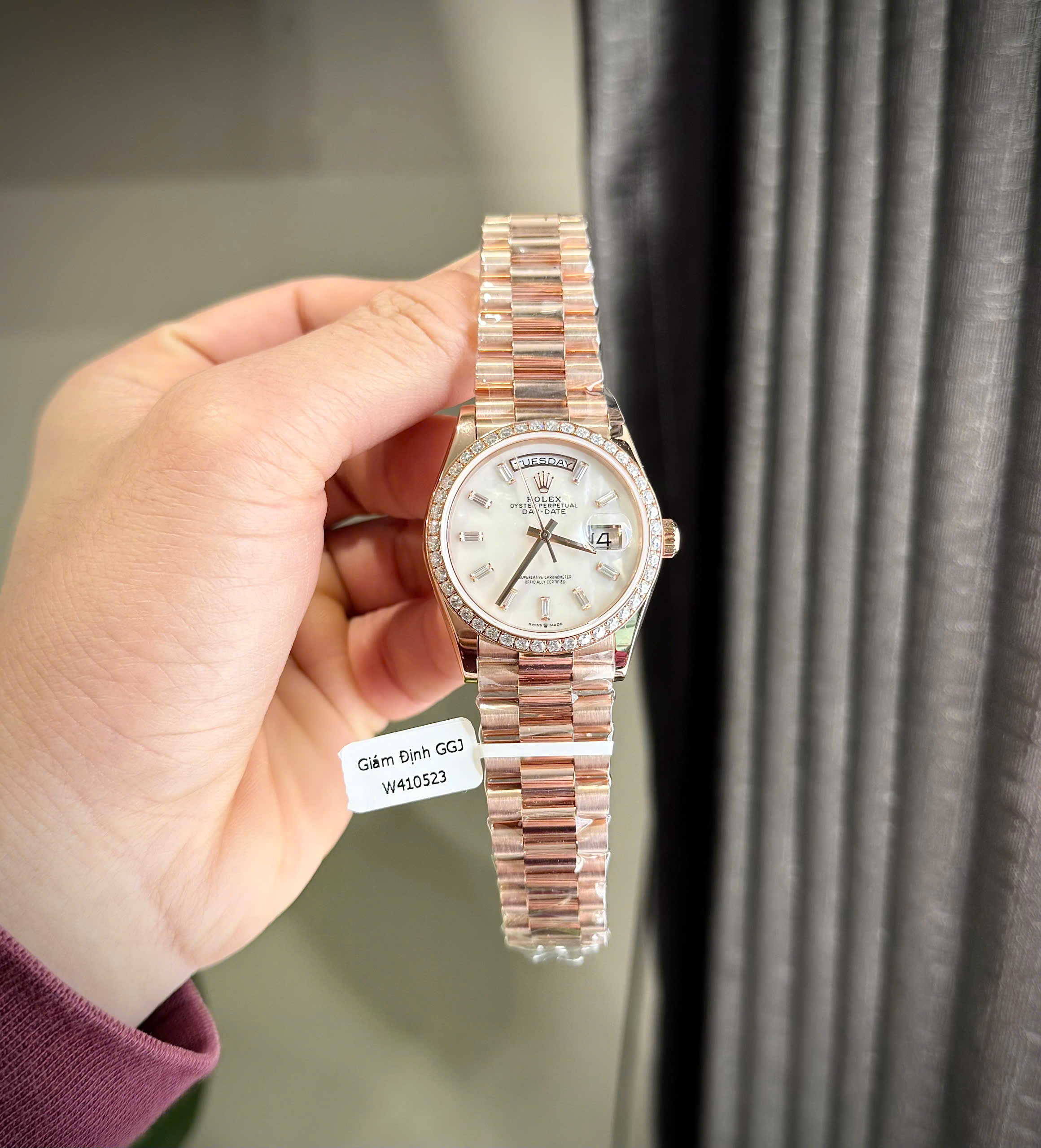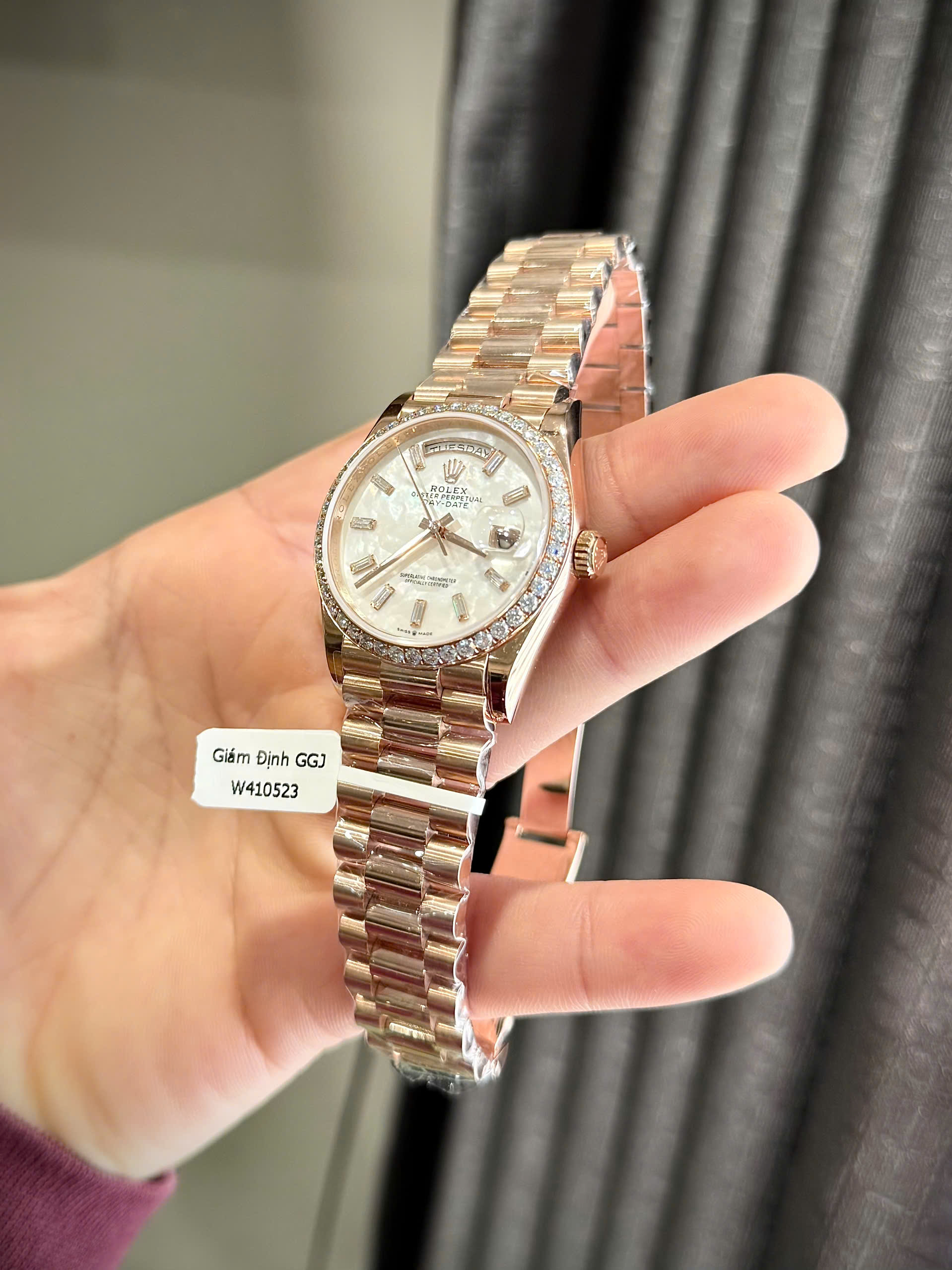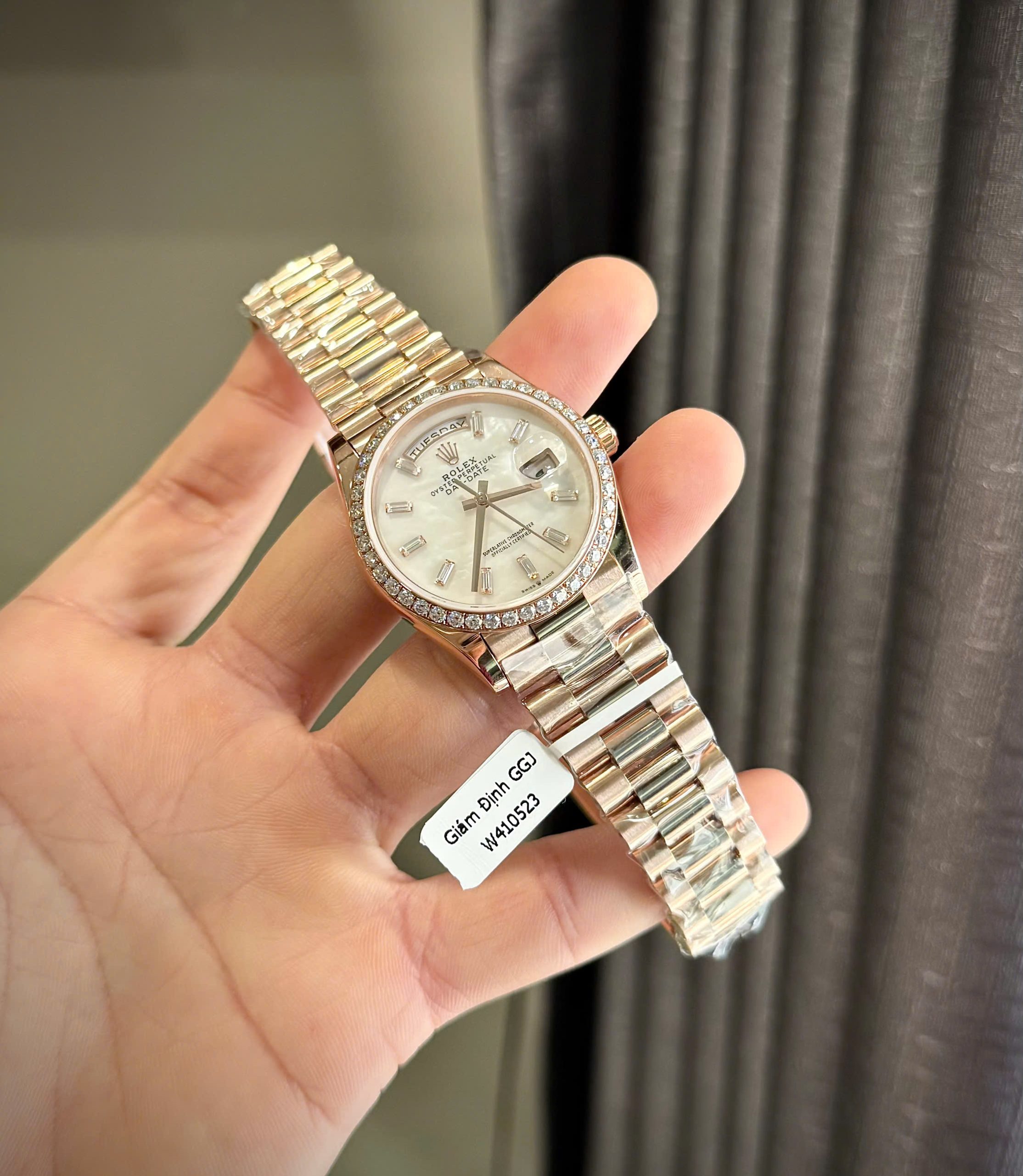 Đồng Hồ Rolex Day-Date Chế Tác Đá Moissanite Bọc Vàng Hồng Mặt Xà Cừ Tự Nhiên 36mm