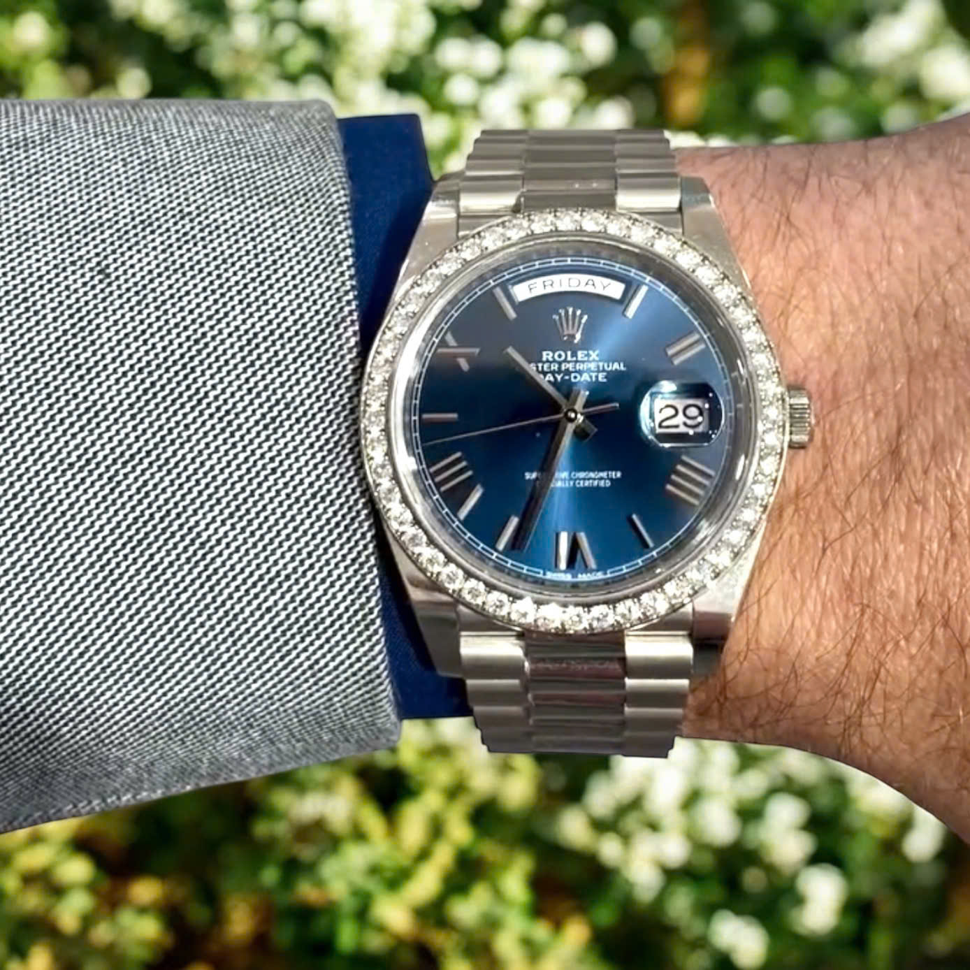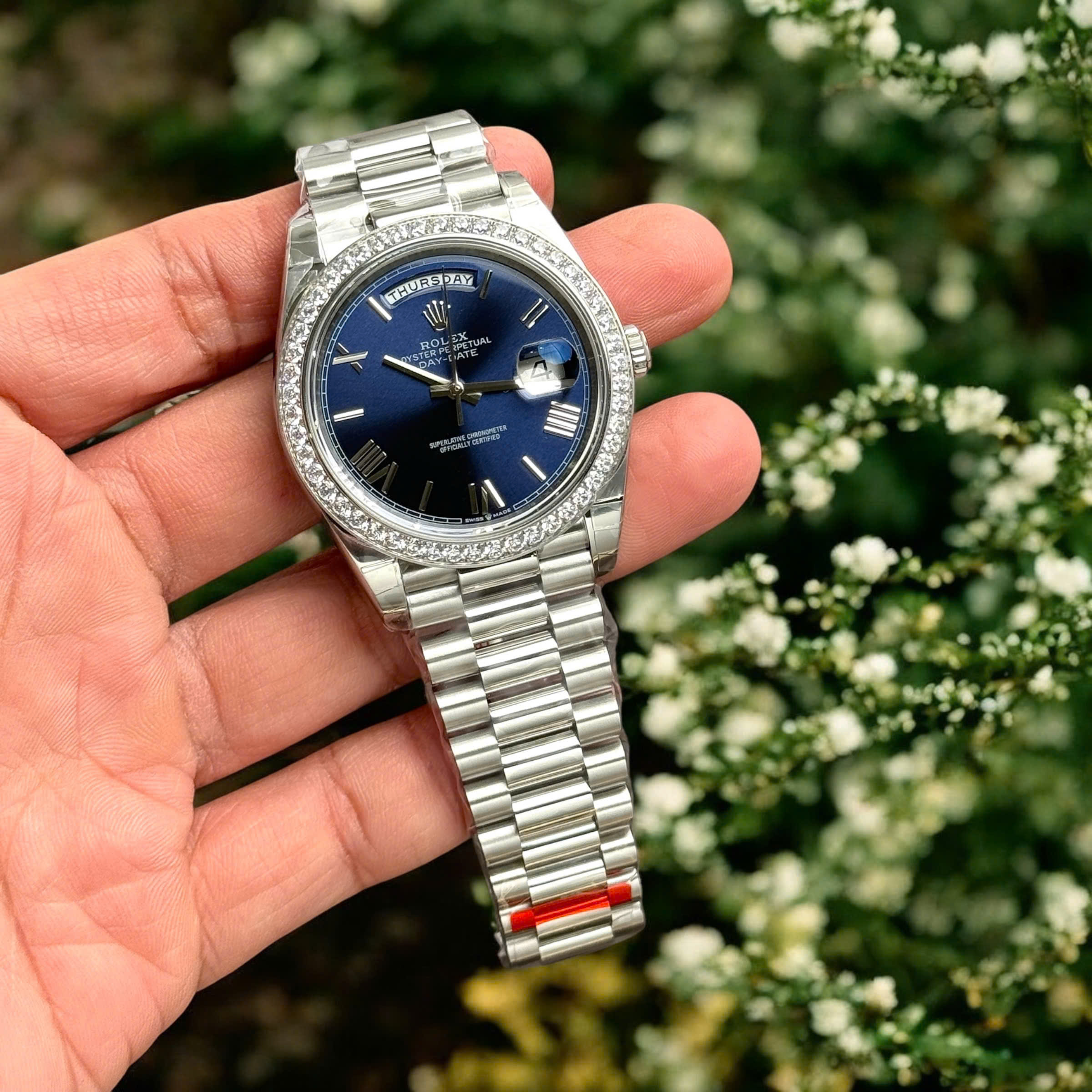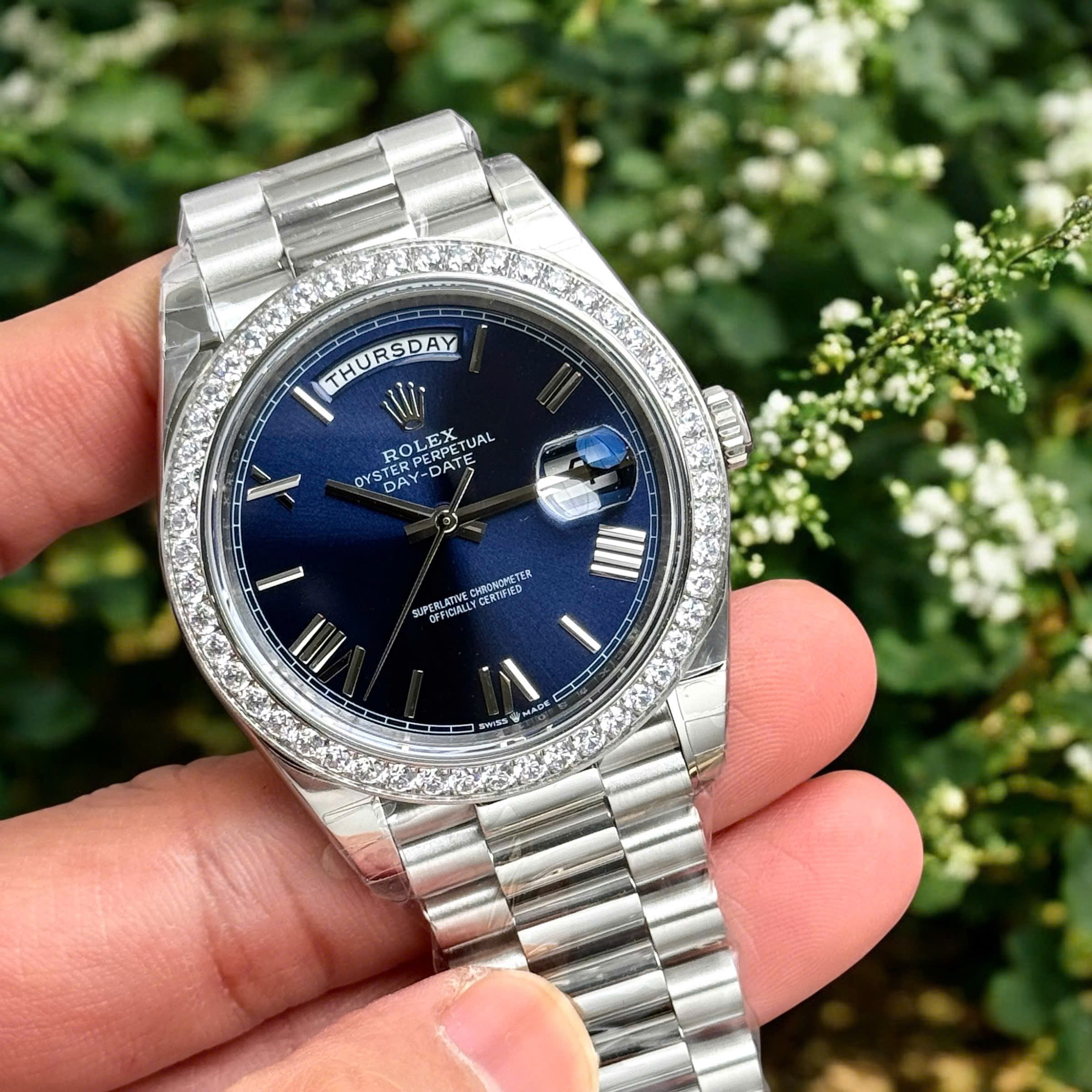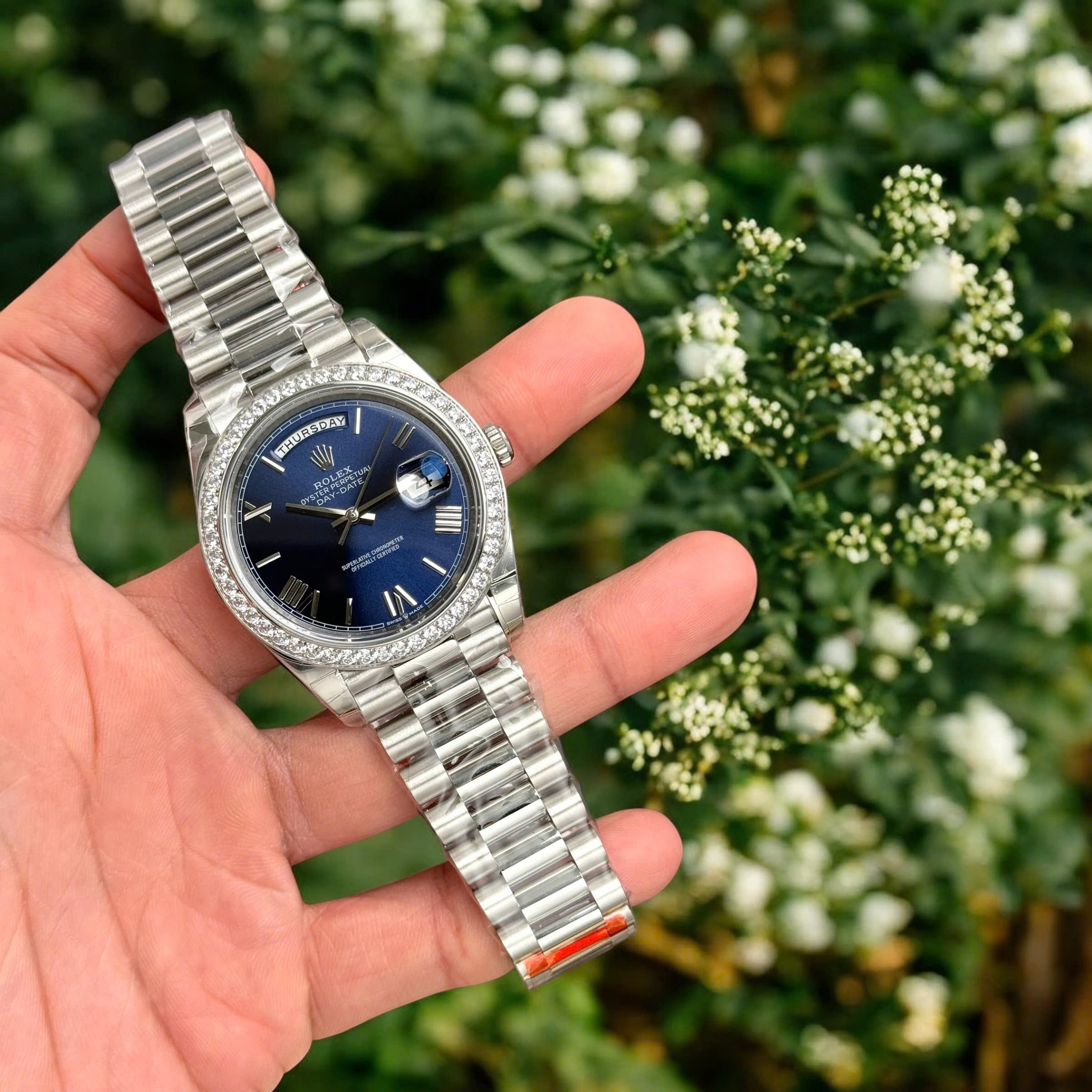 Đồng Hồ Rolex Fake Cao Cấp Day-Date 228236 Mặt Xanh Dương Đính Đá 40mm