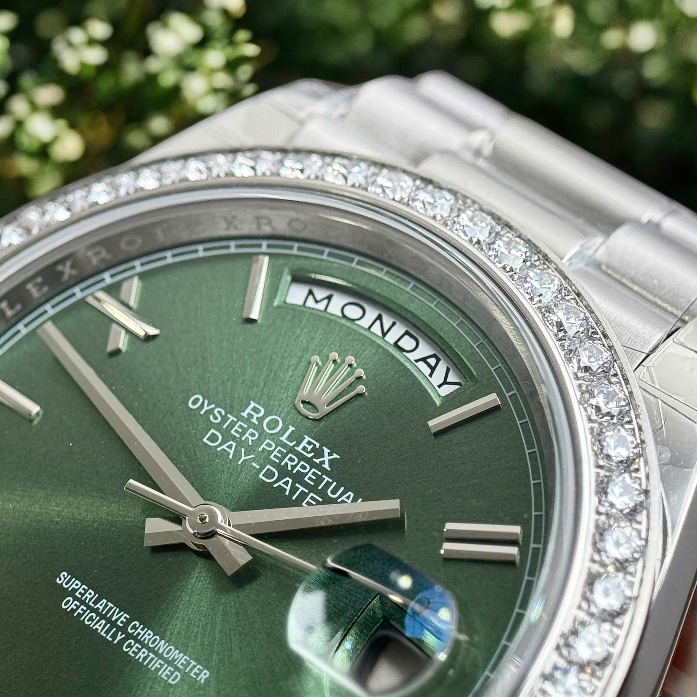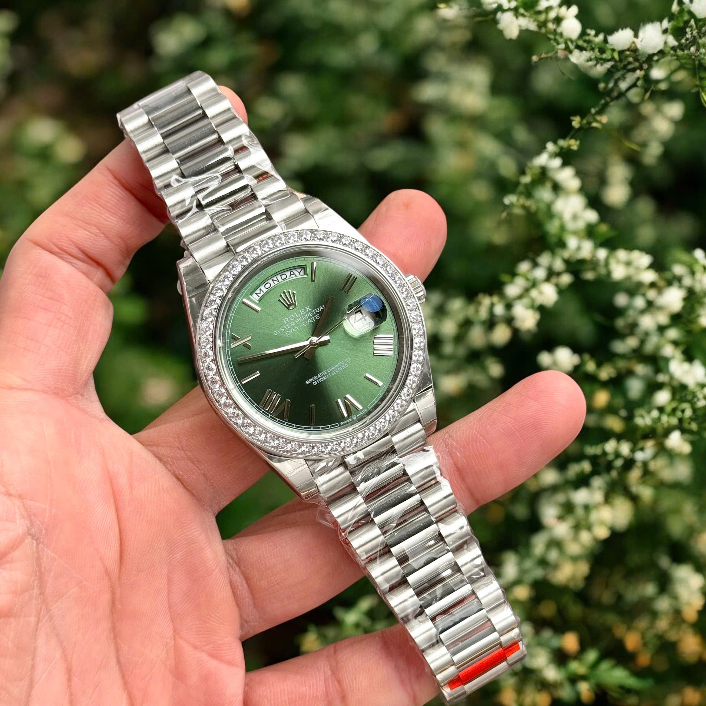 Đồng Hồ Rolex Fake Cao Cấp Day-Date 228236 Mặt Xanh Lá Đính Đá 40mm