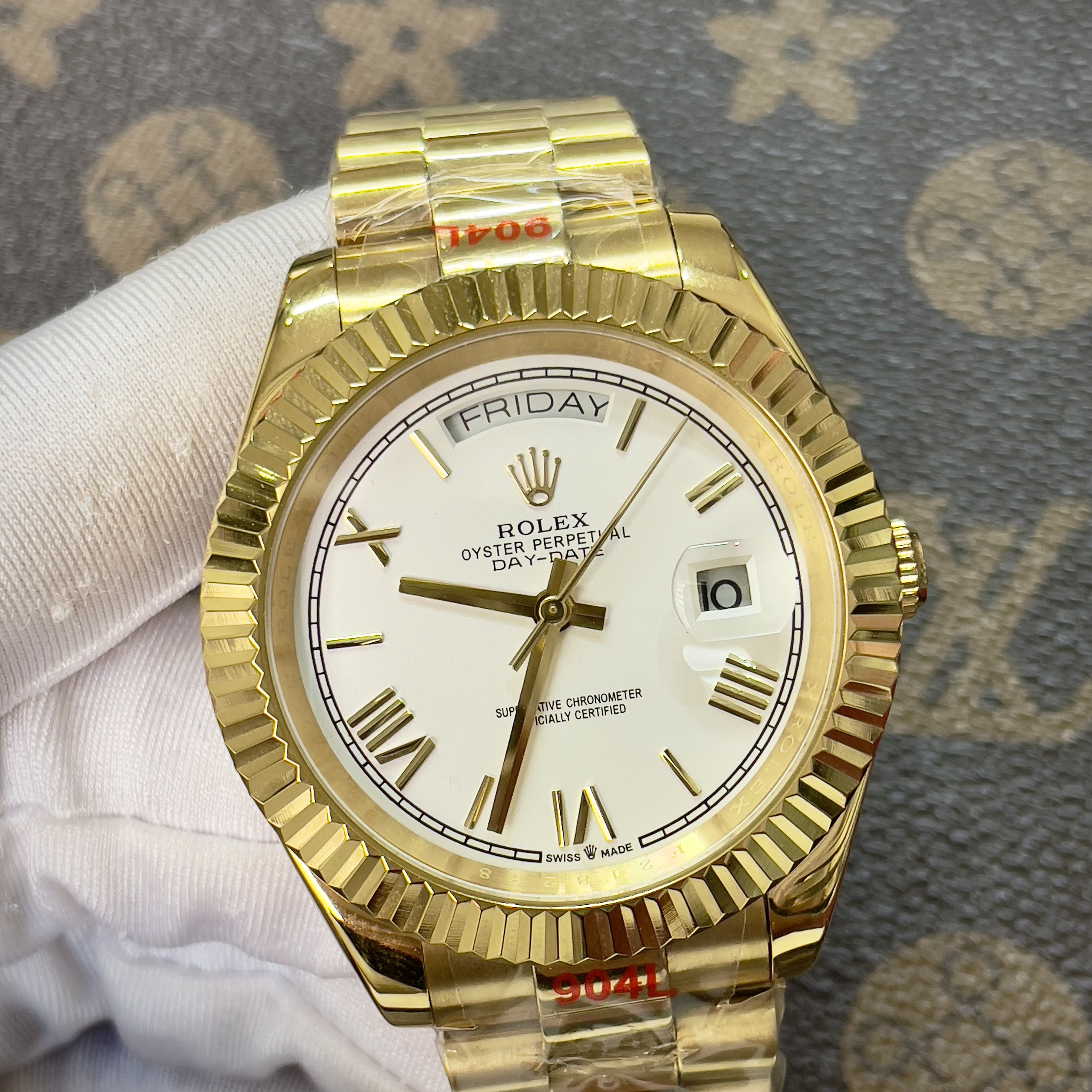 Đồng Hồ Rolex Fake Máy Nhật Màu Vàng Mặt Trắng Day-Date 36-40mm
