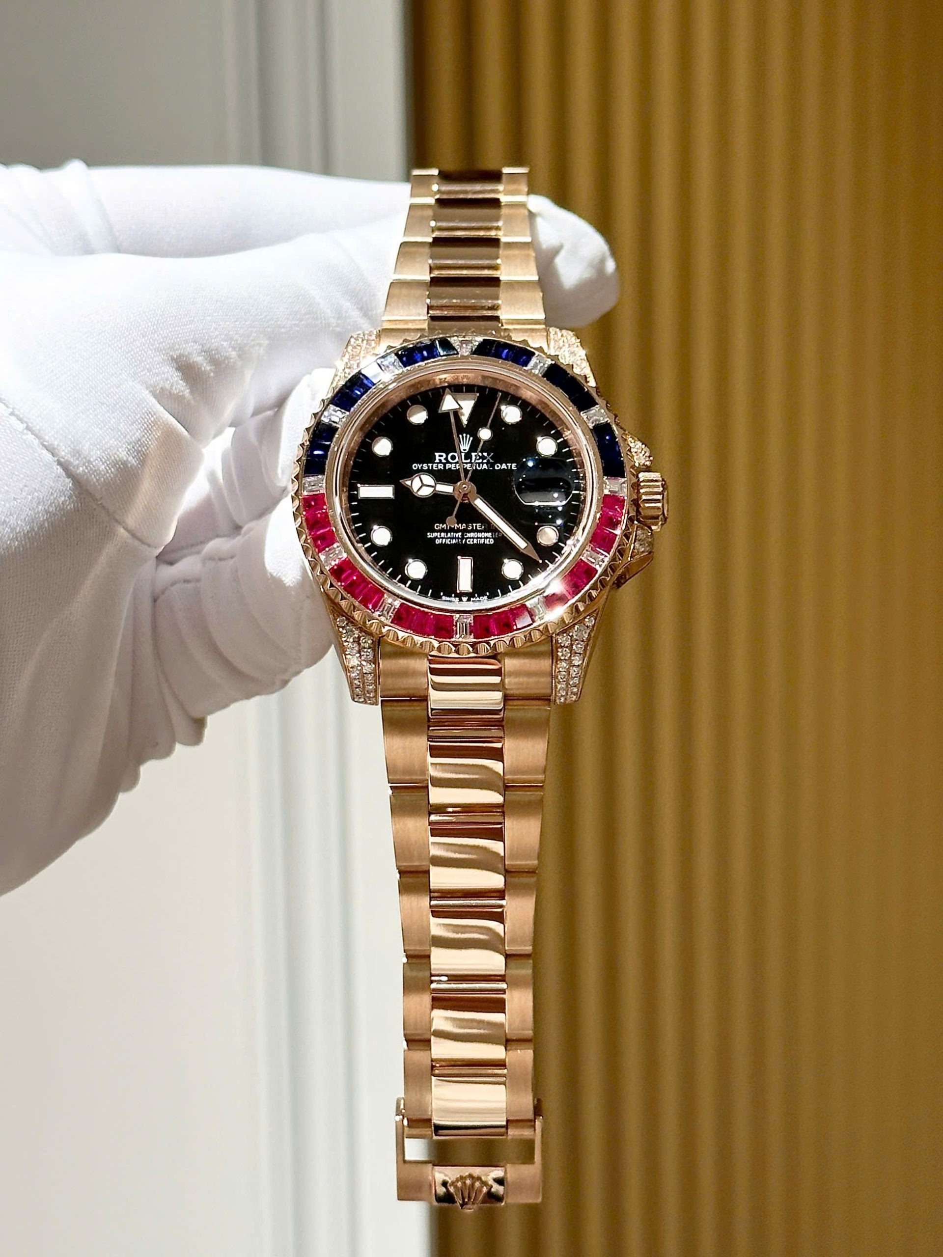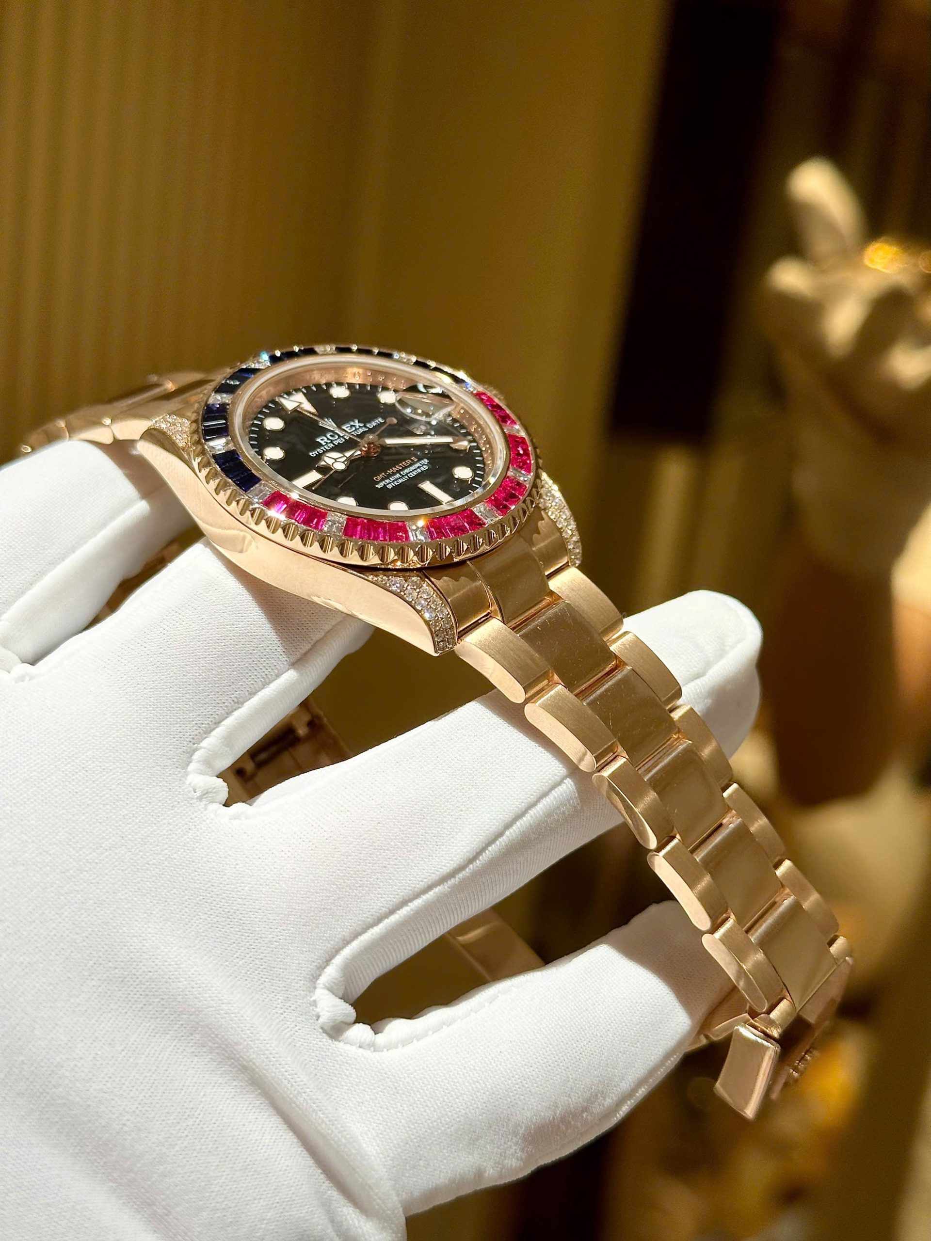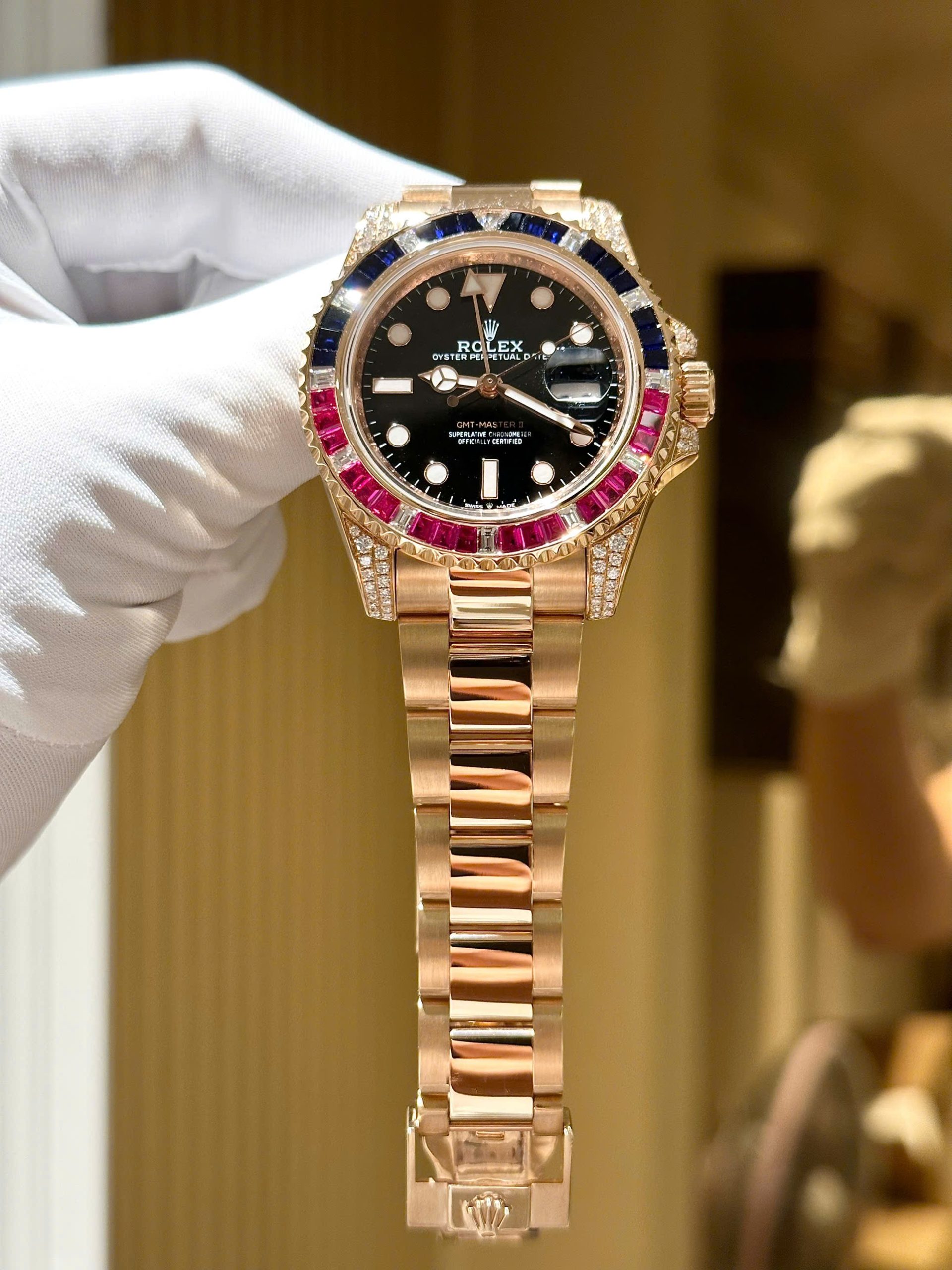Đồng Hồ Rolex GMT Master II Phủ Vàng Đính Đá Quý Tổng Hợp Moissanite 40mm