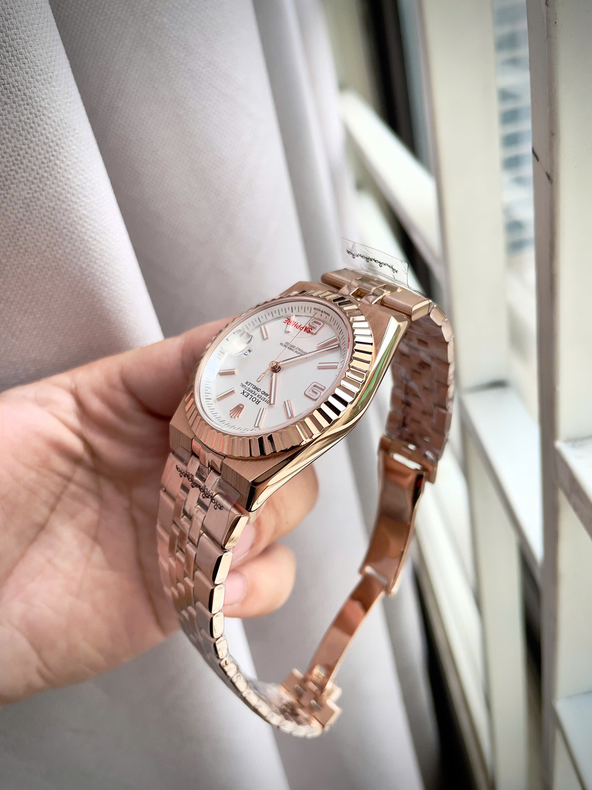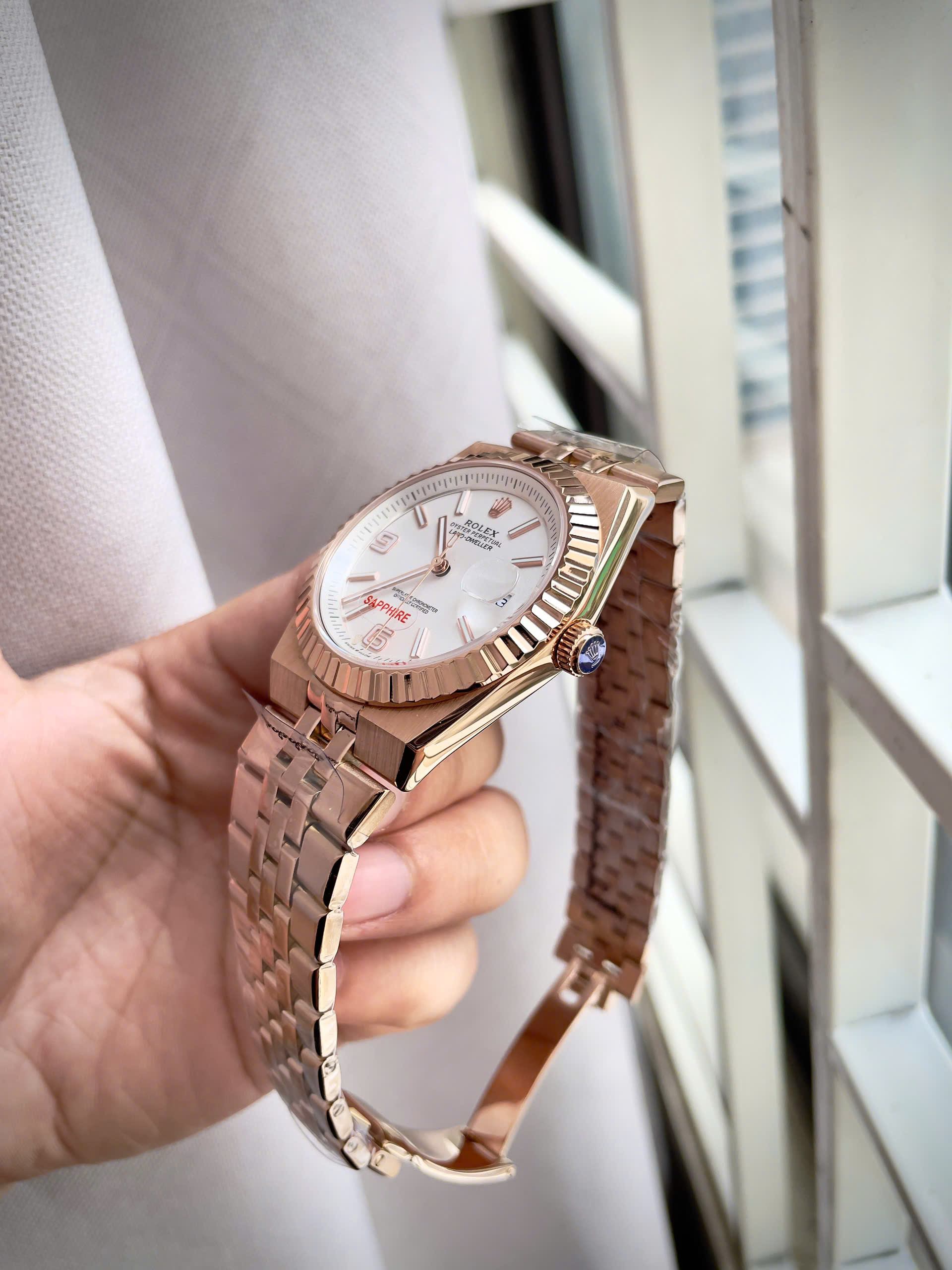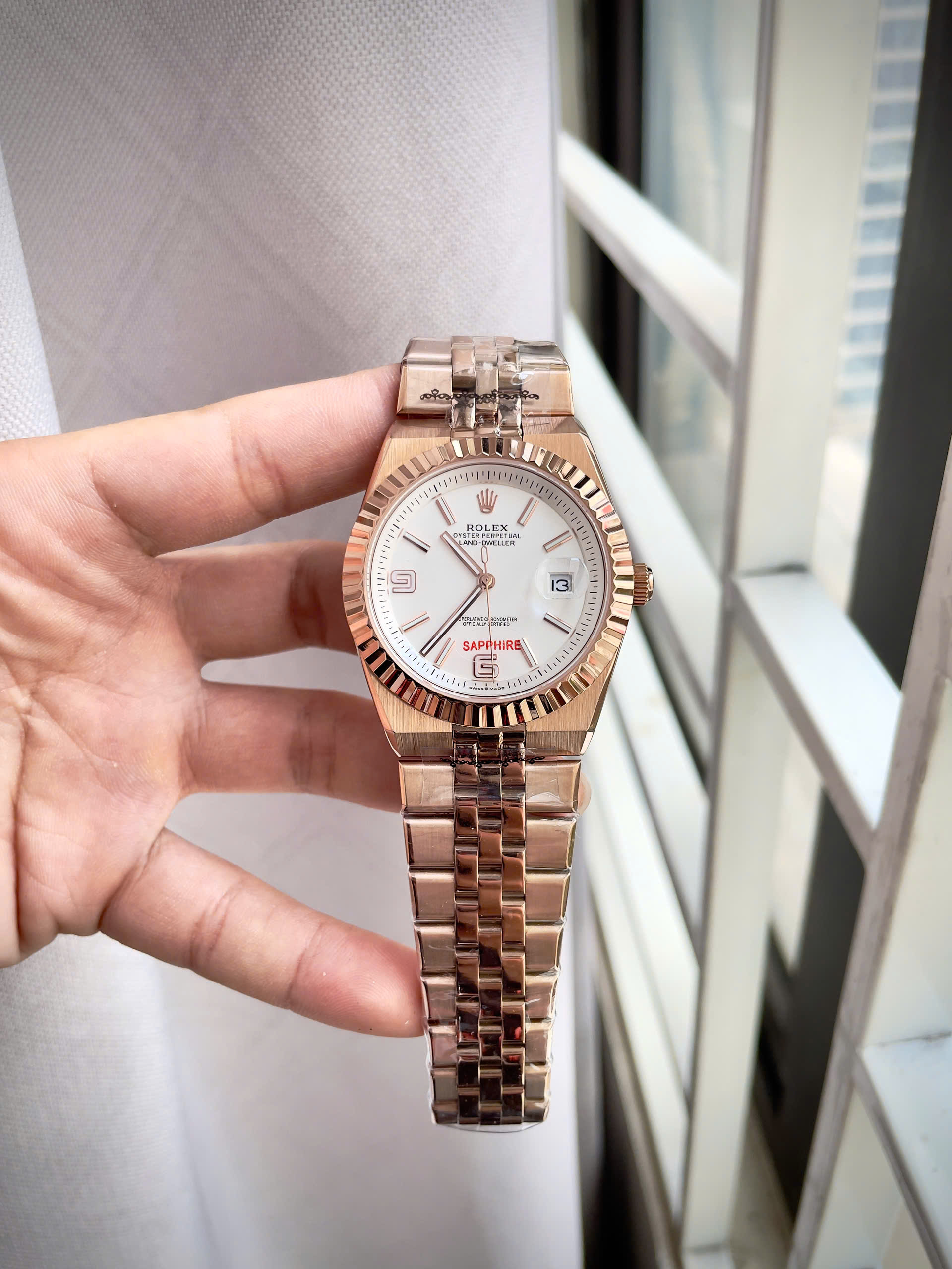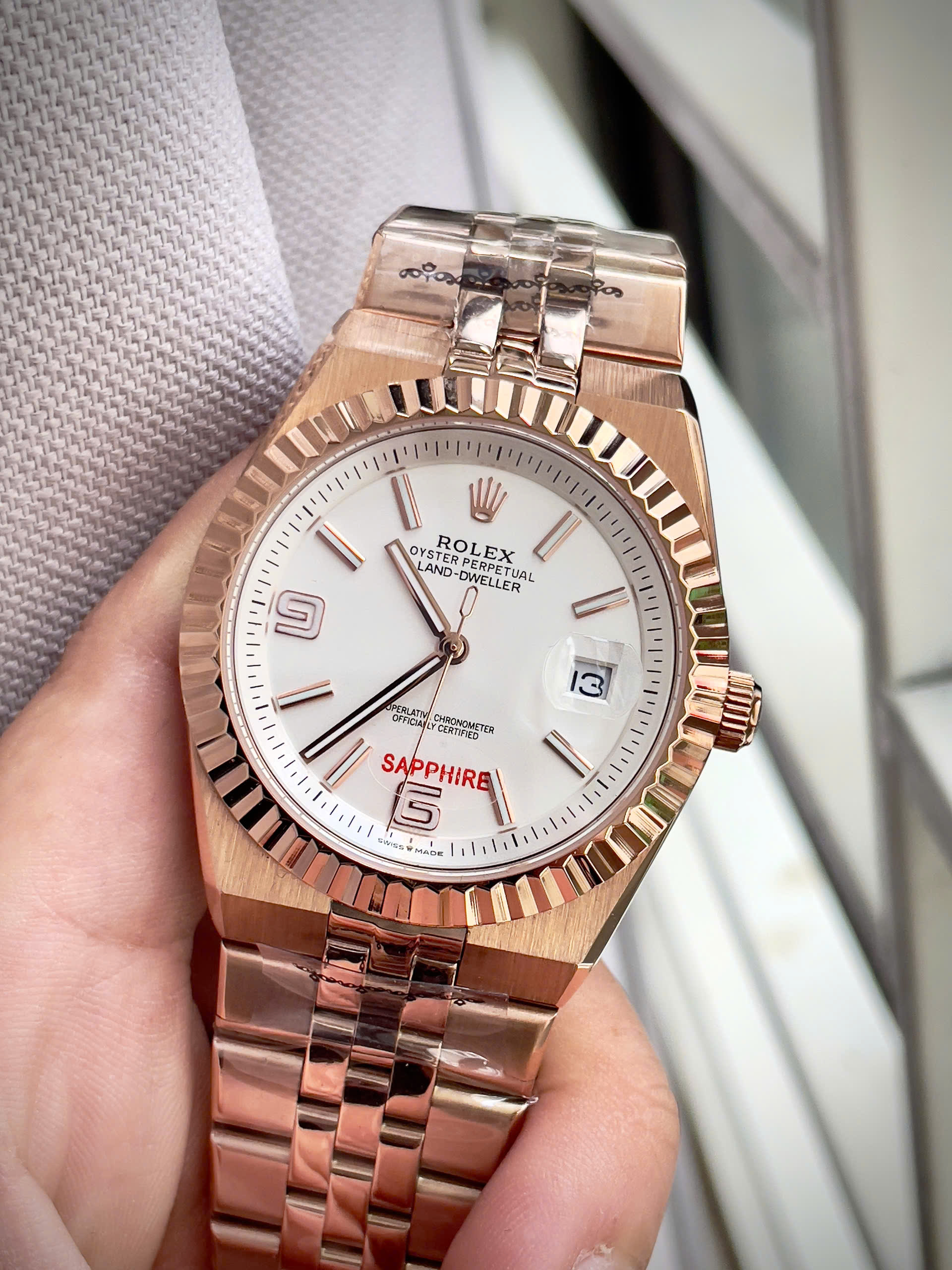 Đồng Hồ Rolex Land-Dweller Fake Cao Cấp Màu Vàng Hồng Mặt Trắng Máy Nhật 40mm