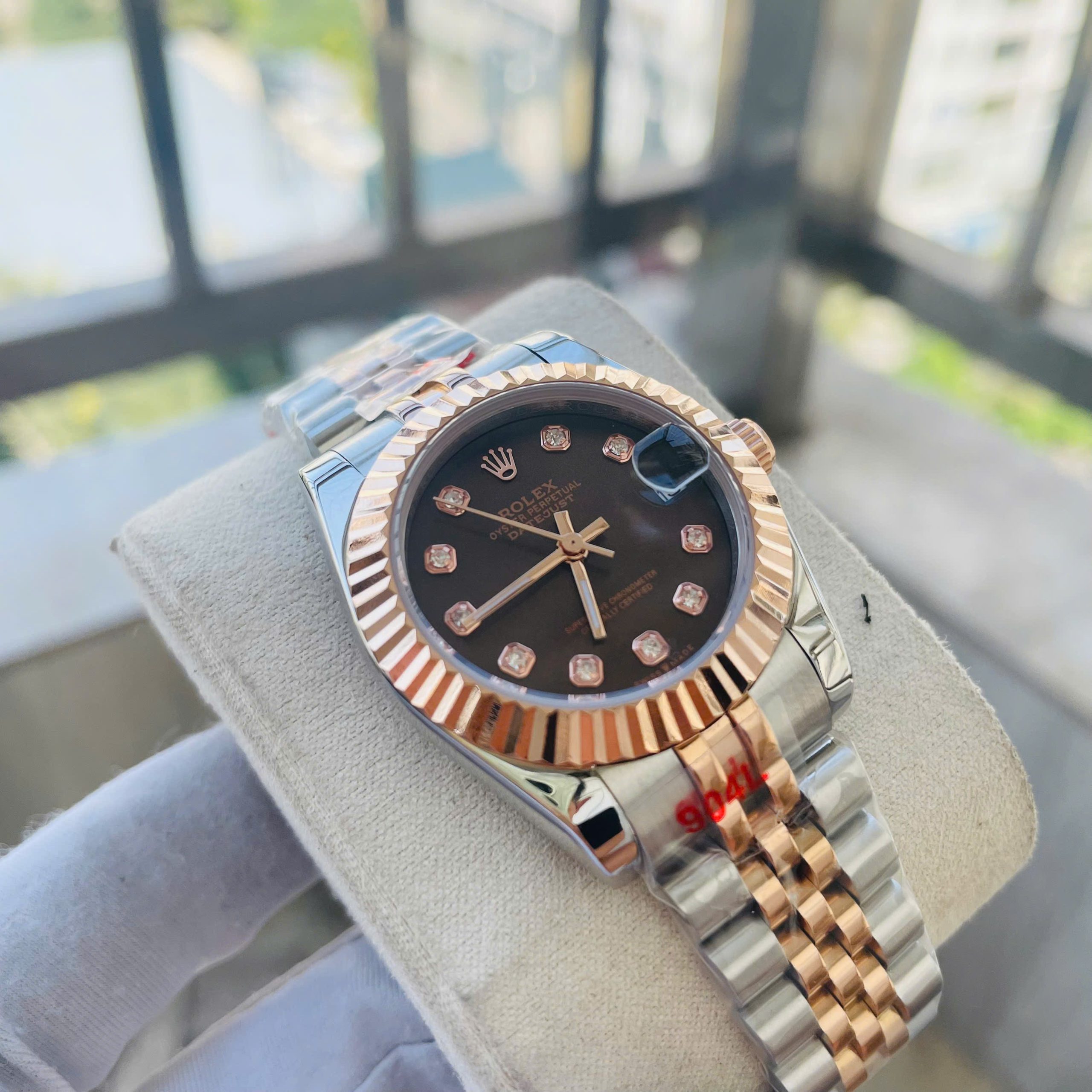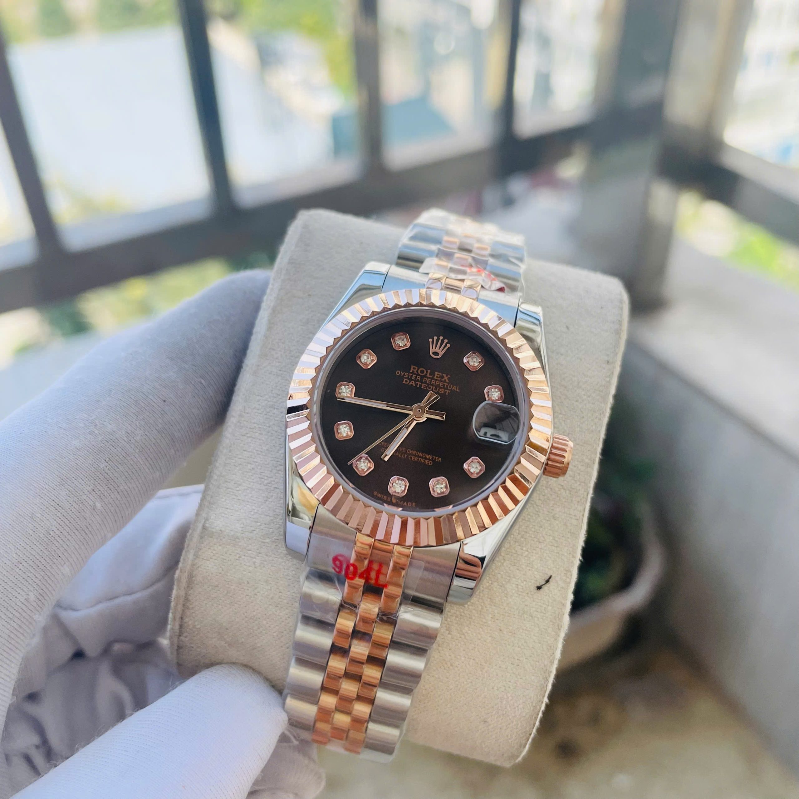 Đồng Hồ Rolex Nữ Dây Kim Loại Fake Máy Nhật DateJust Mặt Nâu Automatic 31mm